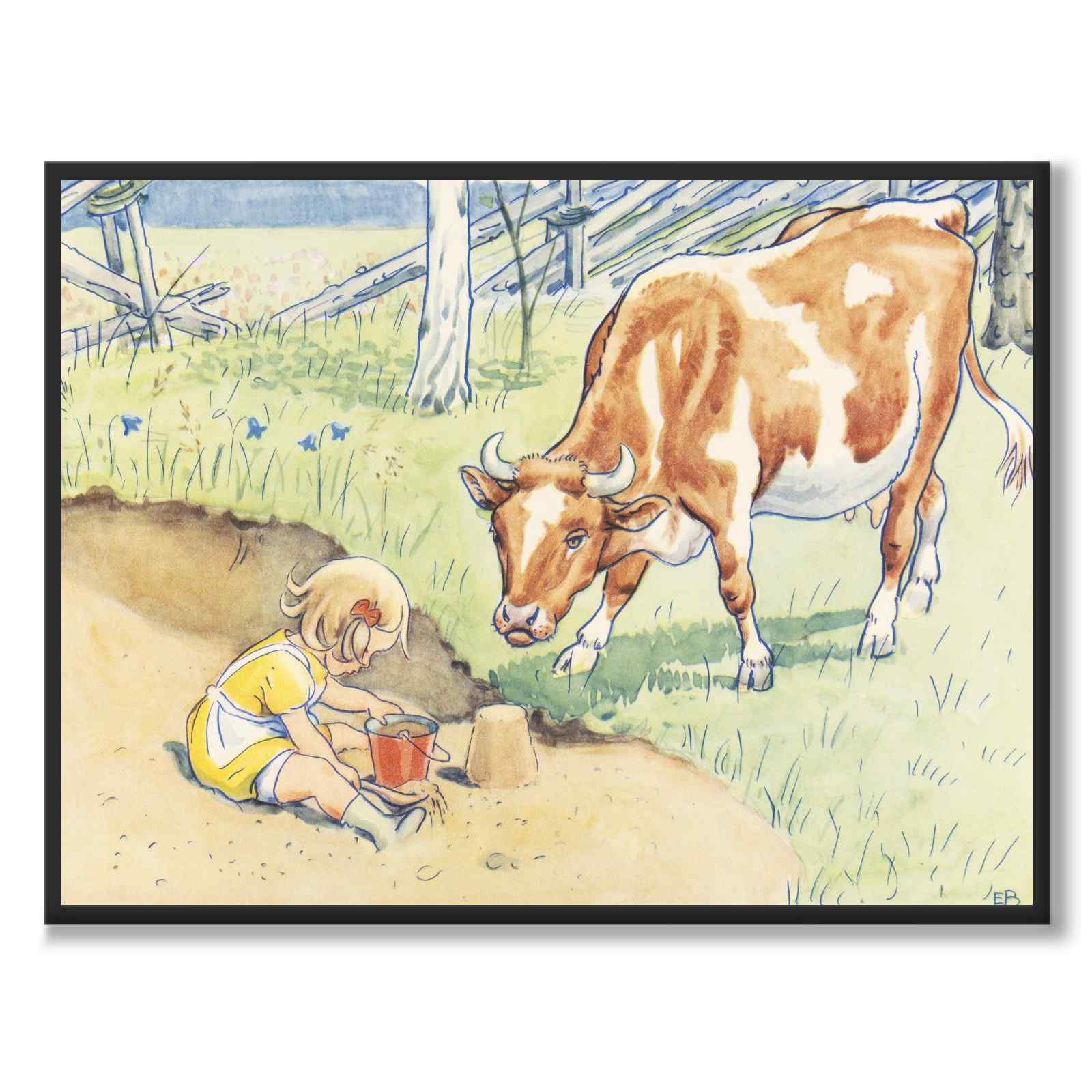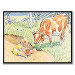 Poster with an illustration from Elsa Beskow's picture book "Duktiga Annika" which was published in 1941. The book is about Annika, a kind and talented girl who helps look after the cow Majros.