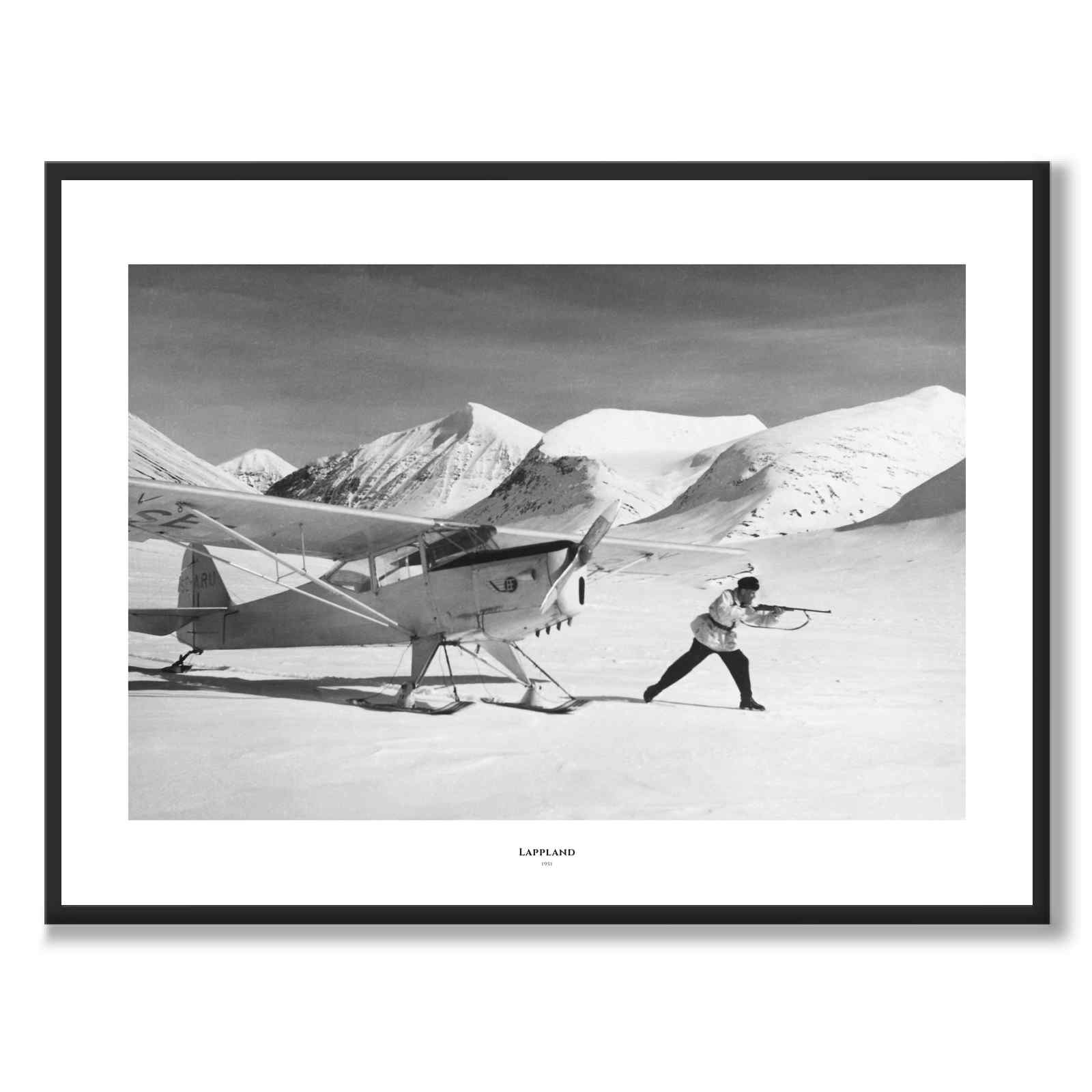 Poster with a unique photograph of Arne Gundersen (1919-2018) who was a celebrated Swedish pilot and flight instructor. Gundersen is probably best known for his participation in the hunt for the so-called Fjälldesperadon in the Lapland mountains in February 1951.