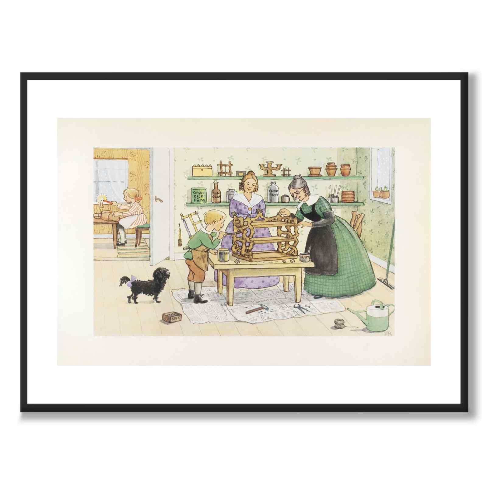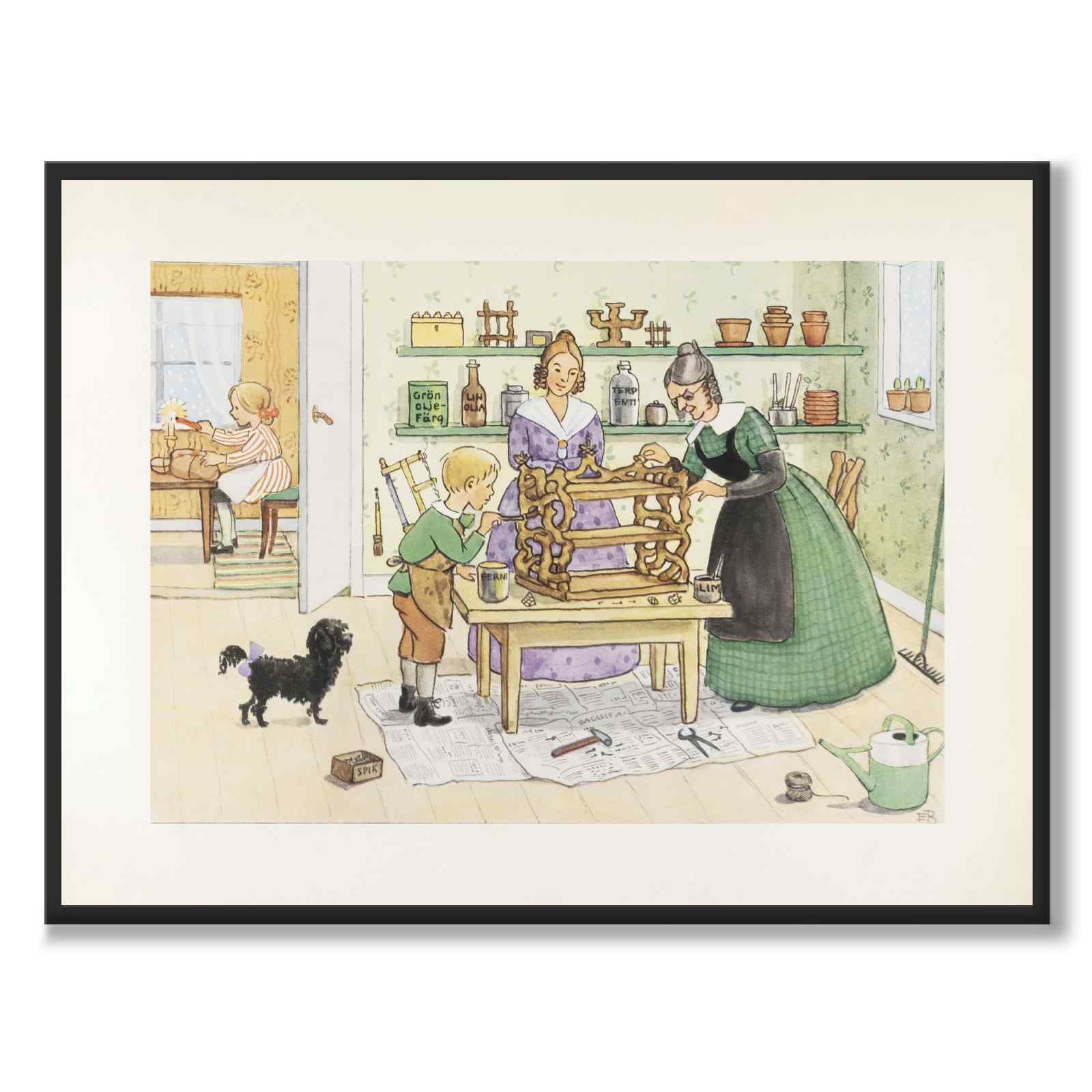 The illustration shows a warm and lively Christmas scene where children and adults work together in a cozy room. On the table is a large straw work that is carefully decorated, while the room is filled with small details such as tools, pots and paint cans that enhance the creative atmosphere. A small dog stands curiously next to it, contributing to the playful atmosphere that characterizes the motif.
