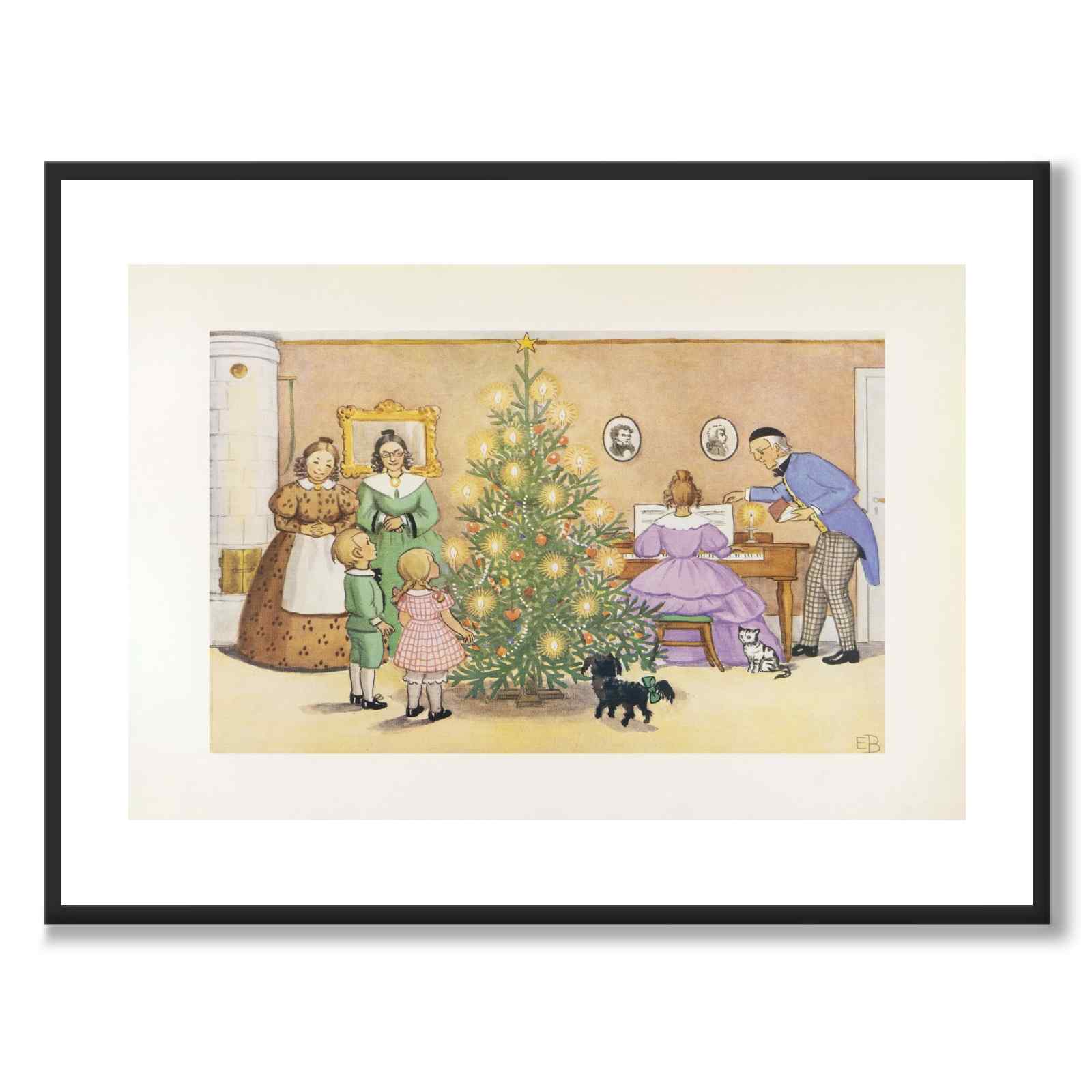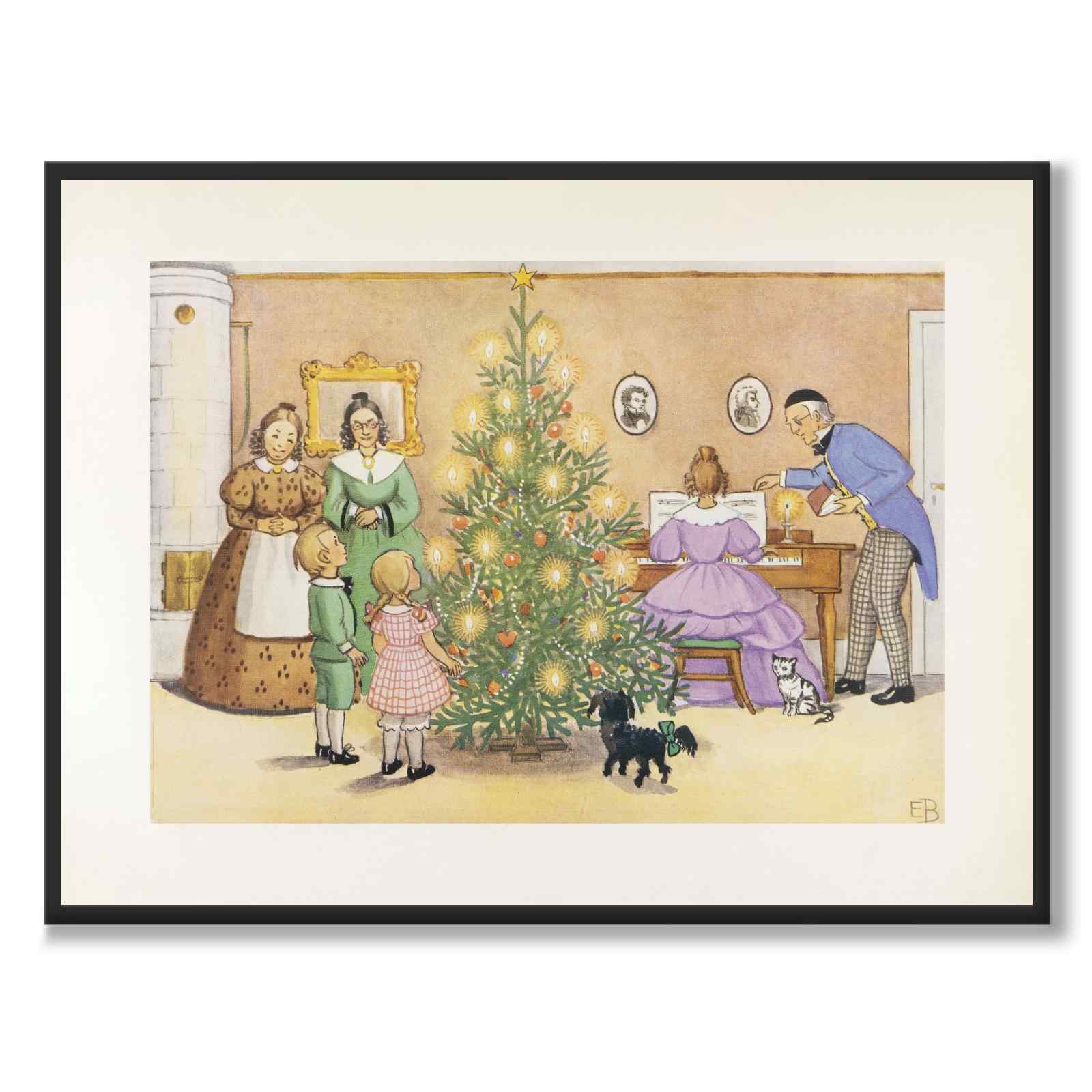 The illustration shows a warm and atmospheric Christmas evening where the family is gathered around a beautifully decorated Christmas tree. Two children stand and admire the Christmas tree lights, while women in the background follow the scene with calm and joy. On the right, a family member sits at the piano and plays, with a man next to him holding sheet music, a moment that reinforces both the community and the traditions of Christmas.