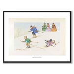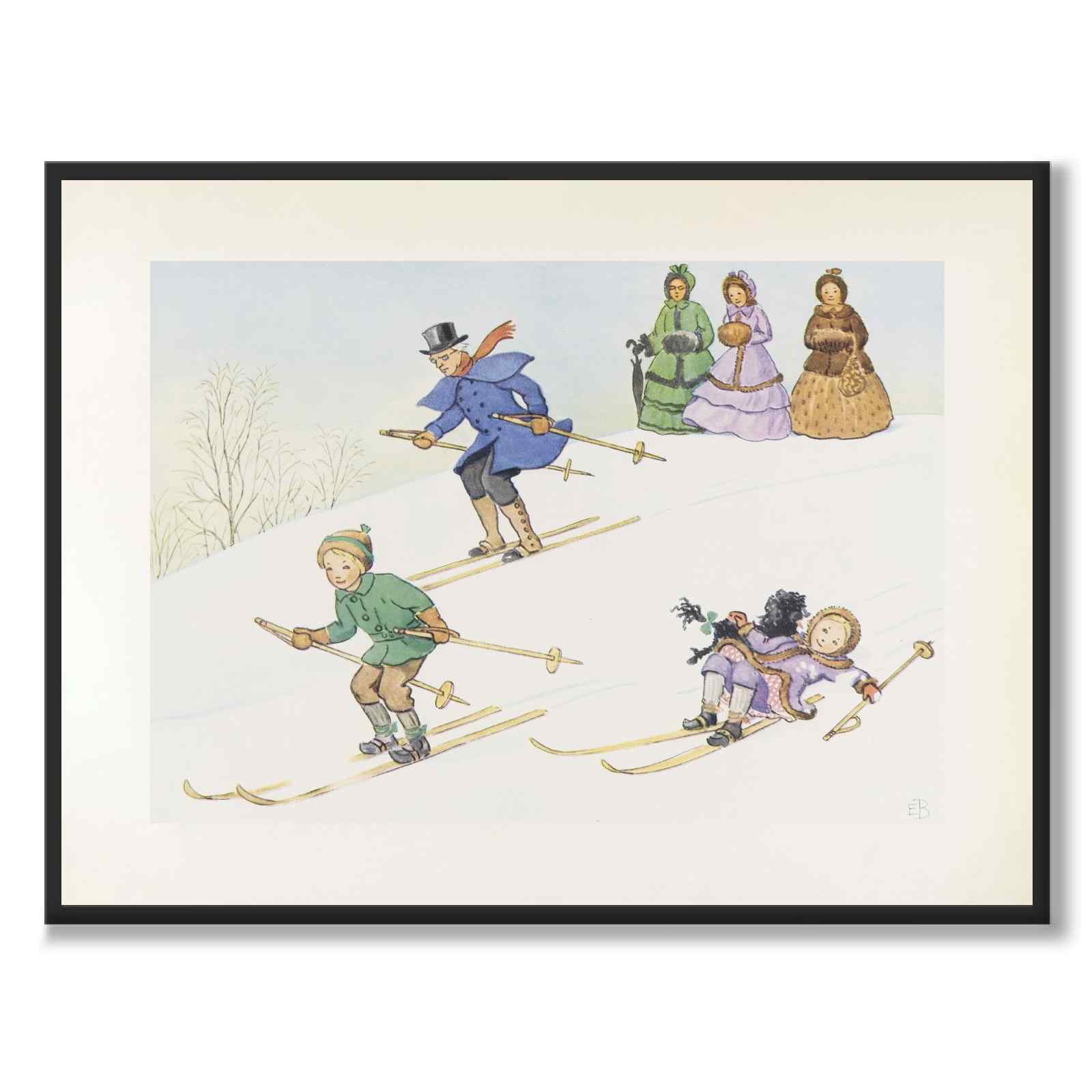 The illustration shows a lively winter day where children are skiing down a slope, full of speed and energy. One of them is sitting on a sled together with a small dog, while others, standing on skis, make their way down with joy and concentration. In the background, three adults in period winter clothing are seen watching the children play, which gives the motif a warm and nostalgic feeling of community and tradition.