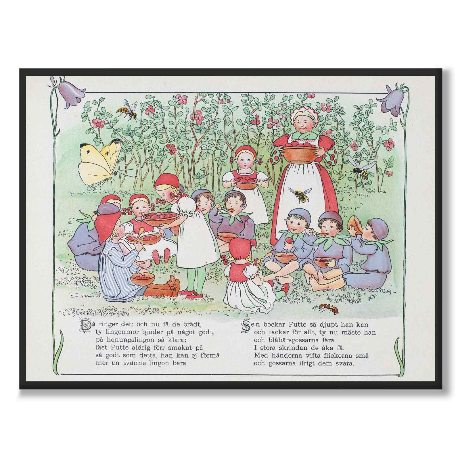 Poster with an illustration from Putte's Adventures in the Blueberry Forest, a beloved Swedish children's book written and illustrated by Elsa Beskow, from the year 1901. It is one of Beskow's most famous works and is considered a classic in Swedish children's literature.
