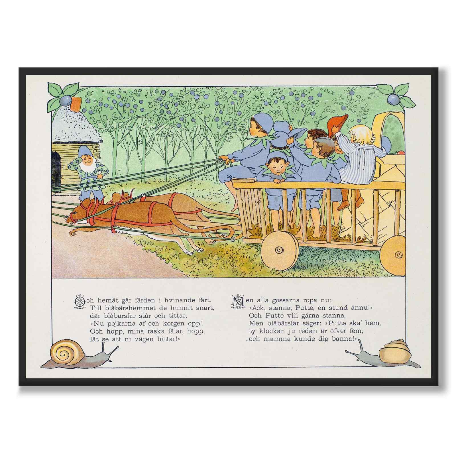 Poster with an illustration from Putte's Adventures in the Blueberry Forest, a beloved Swedish children's book written and illustrated by Elsa Beskow, from the year 1901. It is one of Beskow's most famous works and is considered a classic in Swedish children's literature.