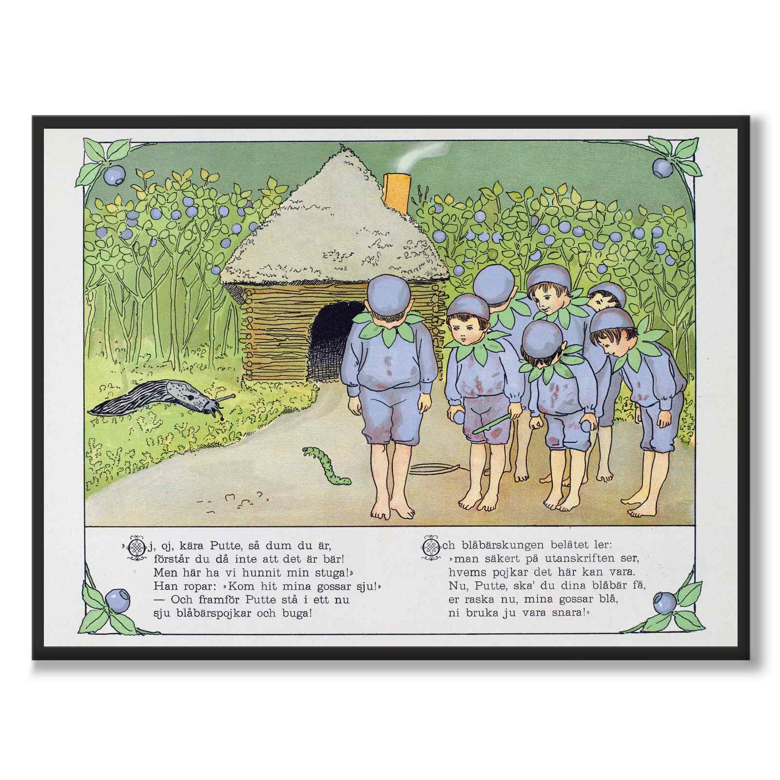 Poster with an illustration from Putte's Adventures in the Blueberry Forest, a beloved Swedish children's book written and illustrated by Elsa Beskow, from the year 1901. It is one of Beskow's most famous works and is considered a classic in Swedish children's literature.