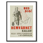 Plakaten fra rundt 1940-tallet oppfordrer til "Reist deg! Heimevernet kaller!" og var en del av en kampanje for å rekruttere flere til Hemvärnet, en frivillig forsvarsorganisasjon i Sverige.