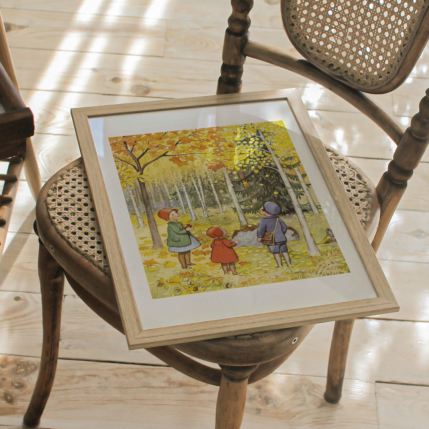 En klassisk plakat illustrert av Elsa Beskow. Illustrasjonen ble publisert i Årets saga i 1927 og navngitt oktober.
