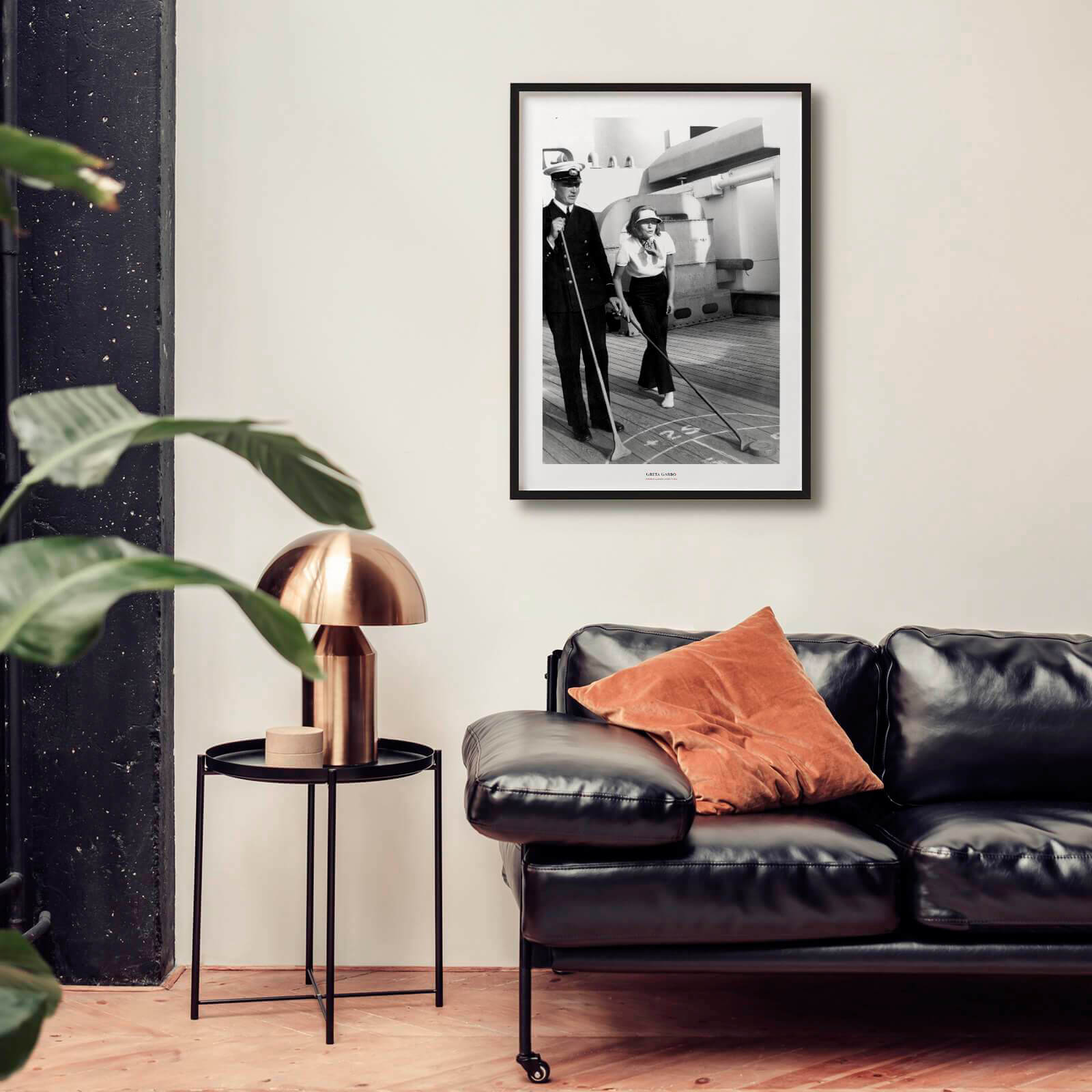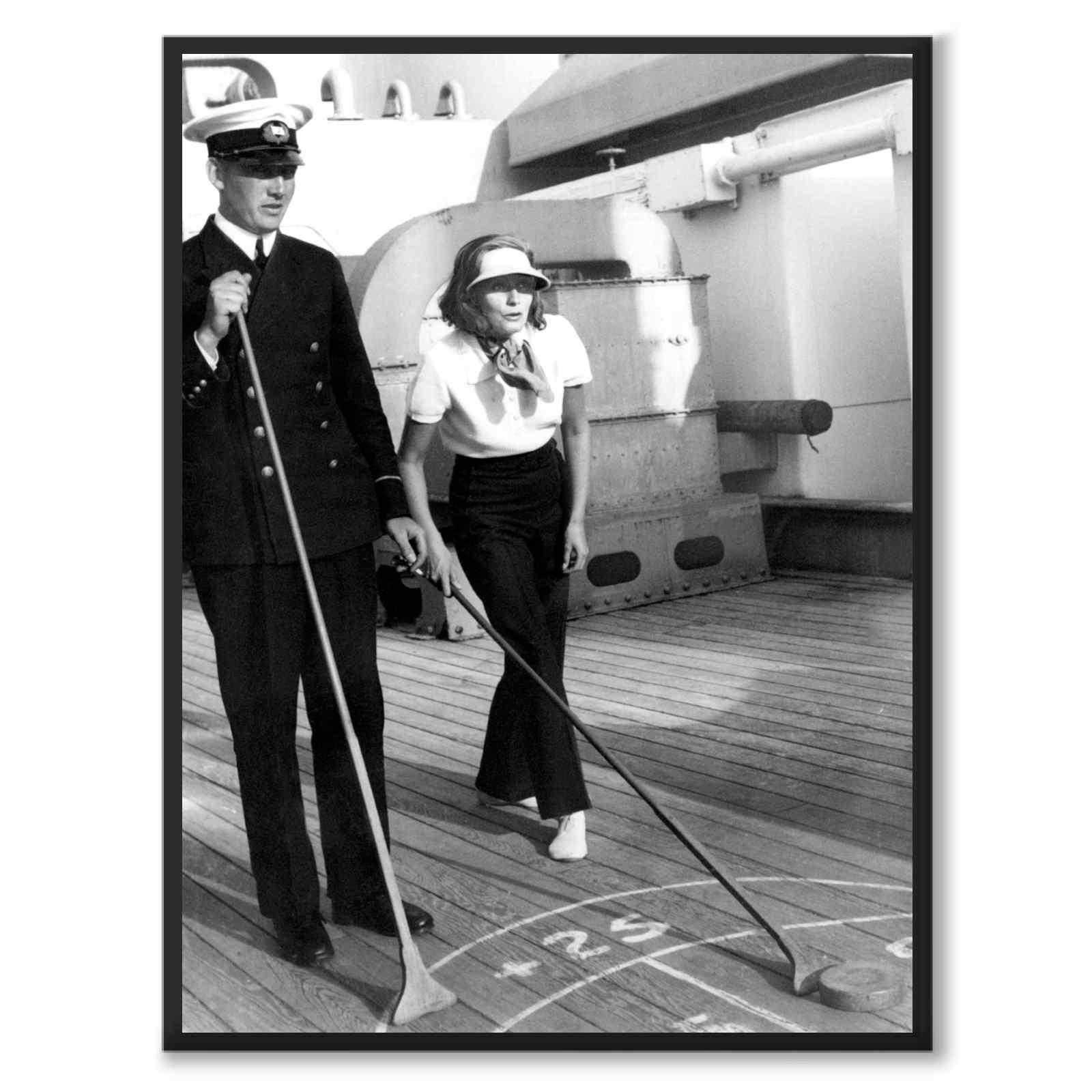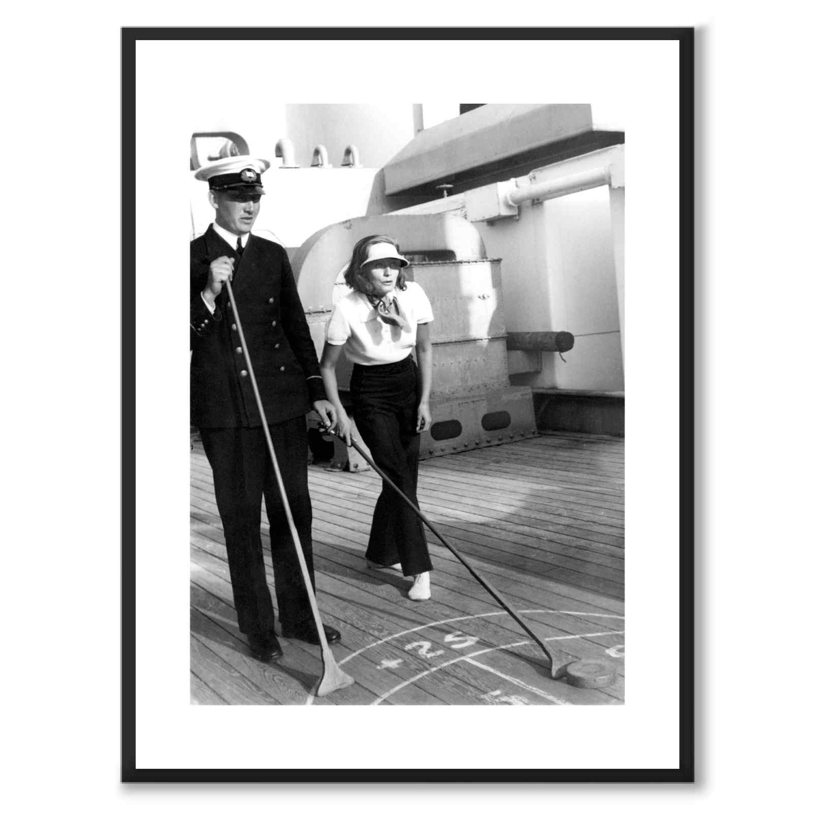 Greta Garbo spelar shuffleboard ombord på ett av Svenska Amerika Liniens fartyg.