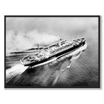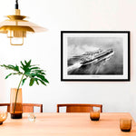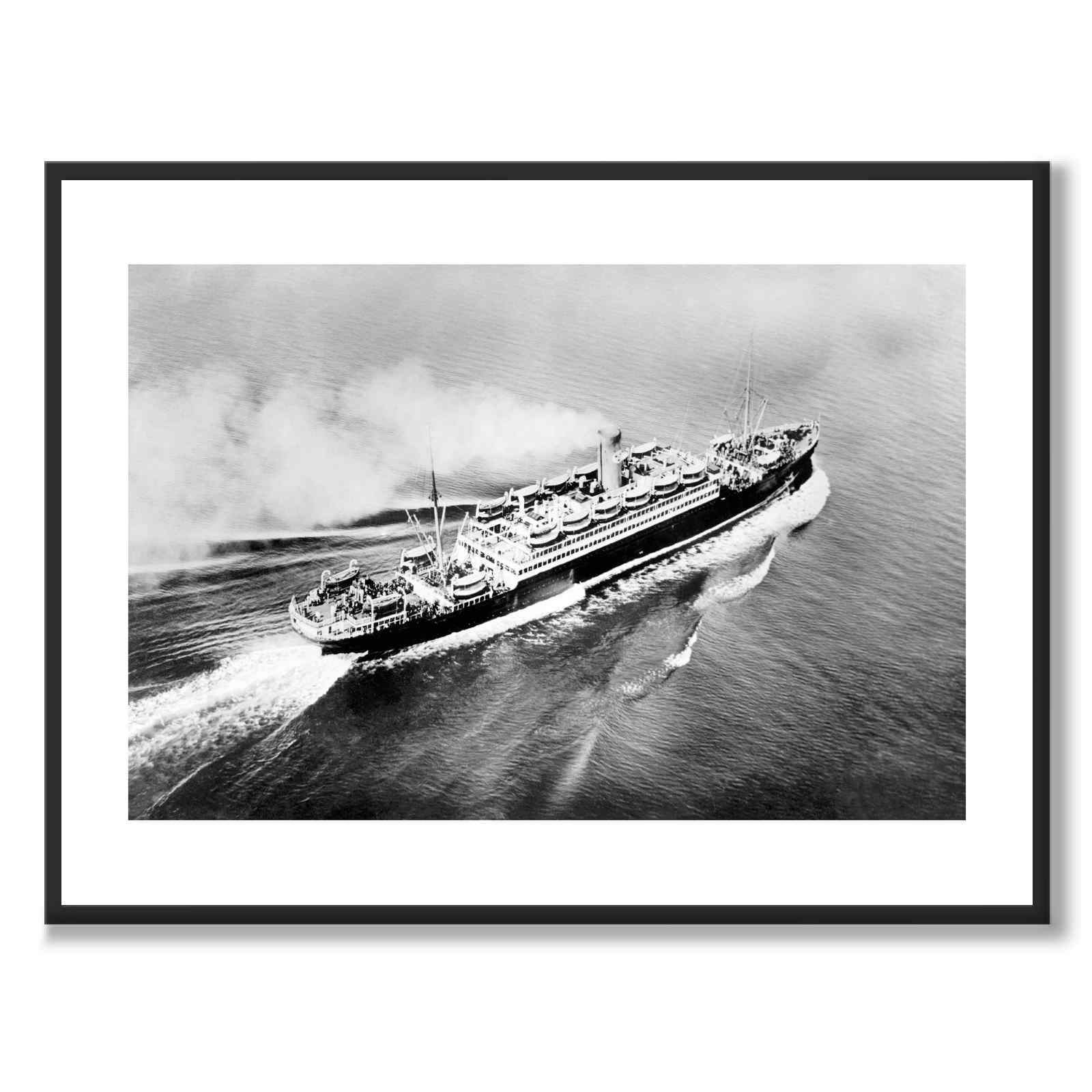 Flygfoto över det transatlantiska passagerarfartyget S/S Drottningholm. Fartyget ägdes av Svenska Amerika Linien mellan år 1920-1946. År 1925 kunde man se Greta Garbo promenera på fartygets passagerardäck under sin resa från Sverige till Amerika och under andra världskriget användes fartyget av Röda Korset för att transportera fångar och sårade. Inte minst vid fångutväxlingarna i Göteborg år 1943-1944 då mer än 10 000 fångar utväxlades.
