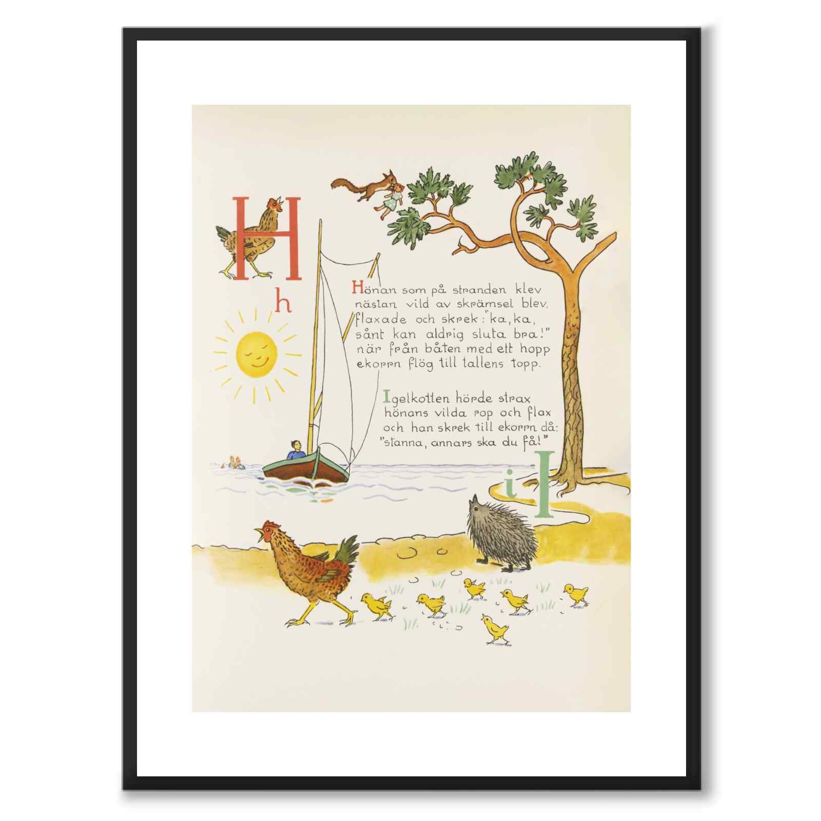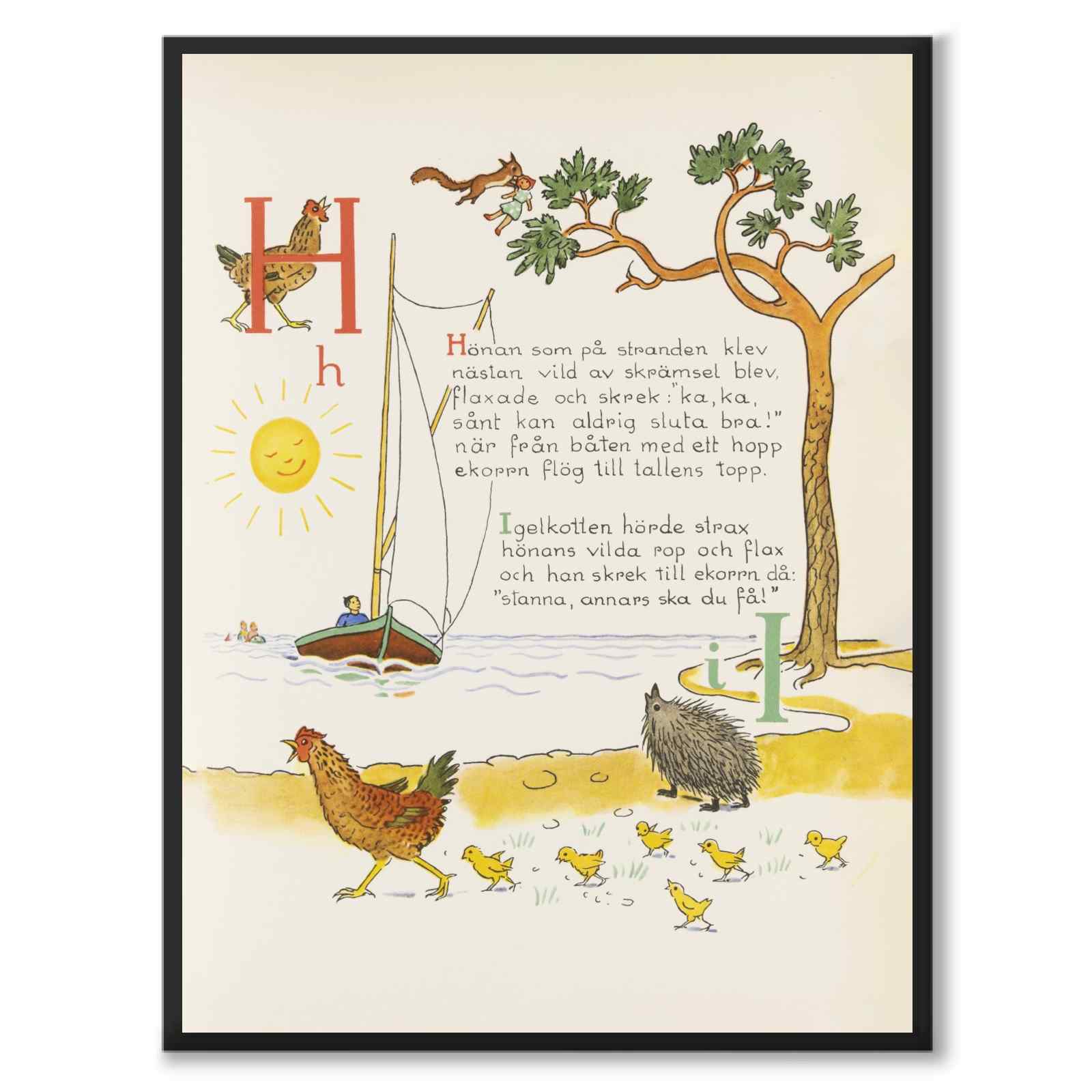 Boken användes för att lära barn alfabetet på ett underhållande och pedagogiskt sätt, då varje bokstav är kopplad till en bild och en kort ramsa. I denna bild presenteras bokstäverna H & I, med illustrationer på en höna som leder sina kycklingar och en igelkott.