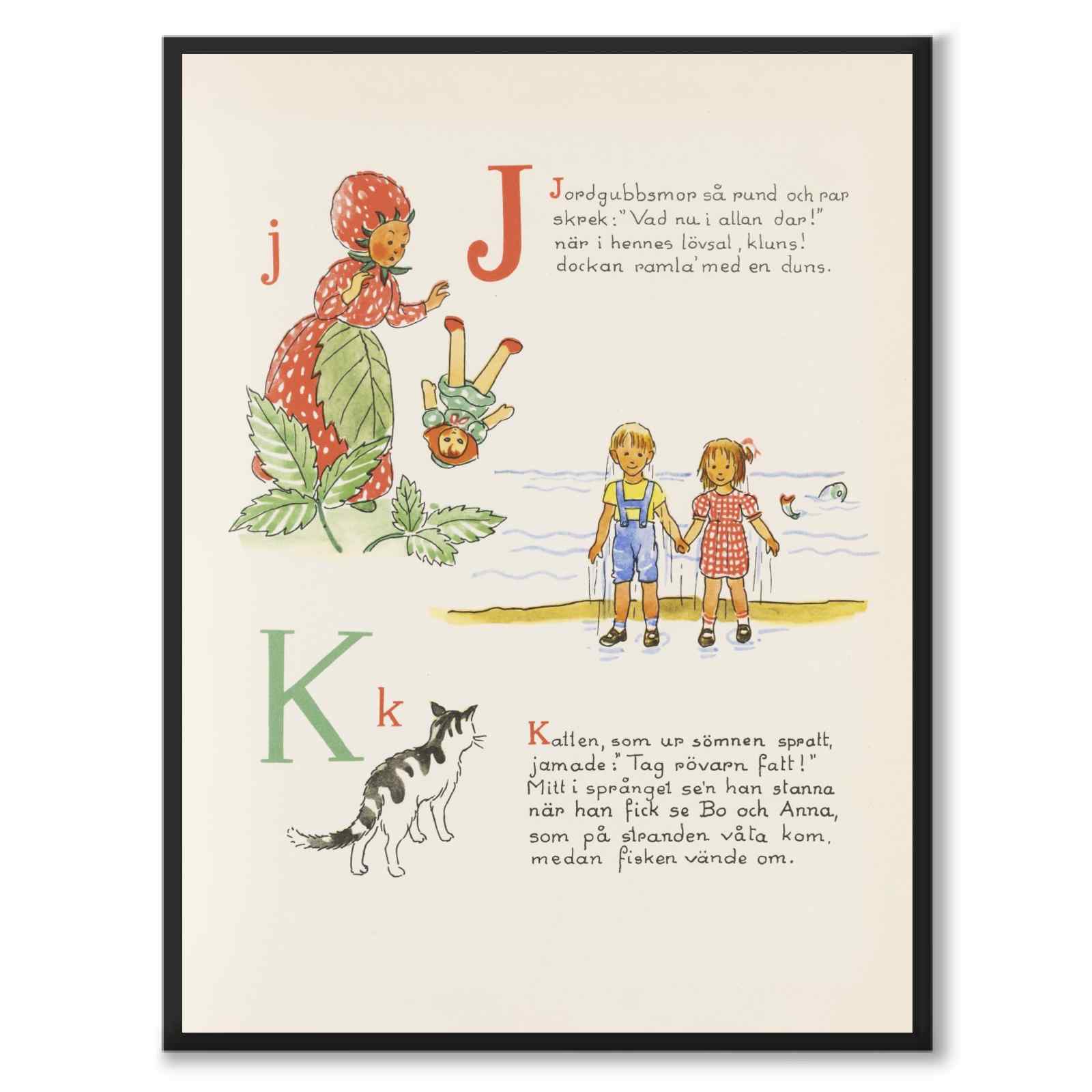 Boken användes för att lära barn alfabetet på ett underhållande och pedagogiskt sätt, då varje bokstav är kopplad till en bild och en kort ramsa. I denna bild presenteras bokstäverna J & K, med illustrationer på en jordgubb, "jordgubbsmor", och en katt.