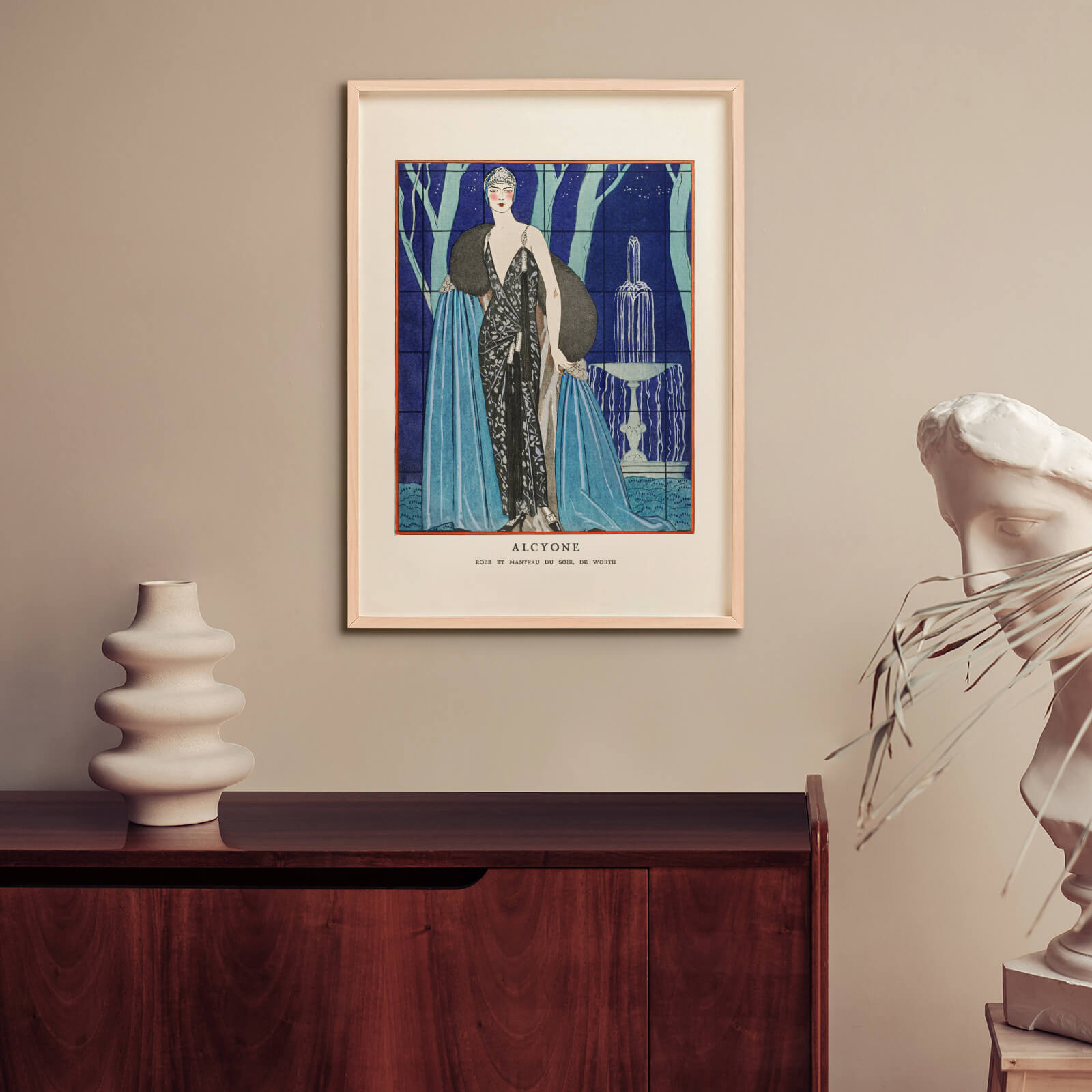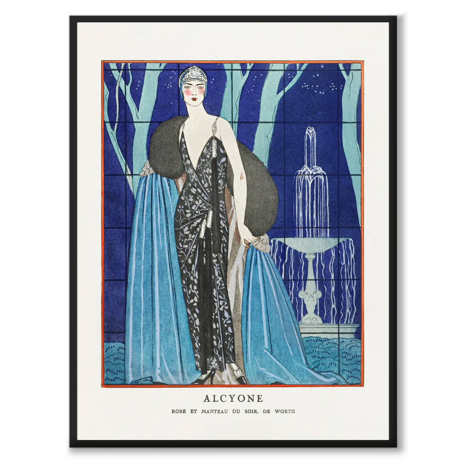 Poster med en illustration från ett franskt modemagasin år 1923. På illustrationen ser du texten Alcyone. Robe et manteau du soir, de Worth - franska för Alcyone. Aftonklänning och kappa, av Worth