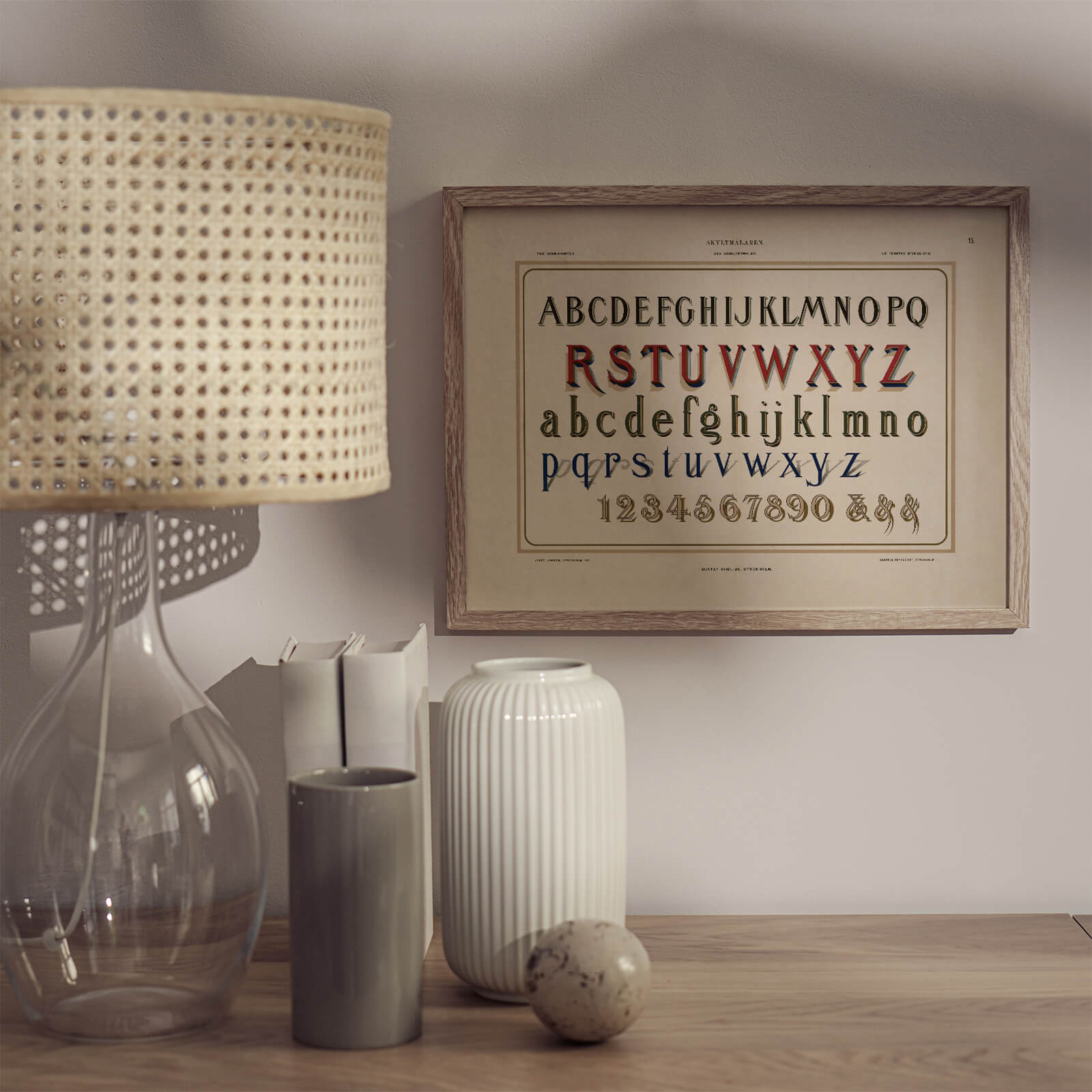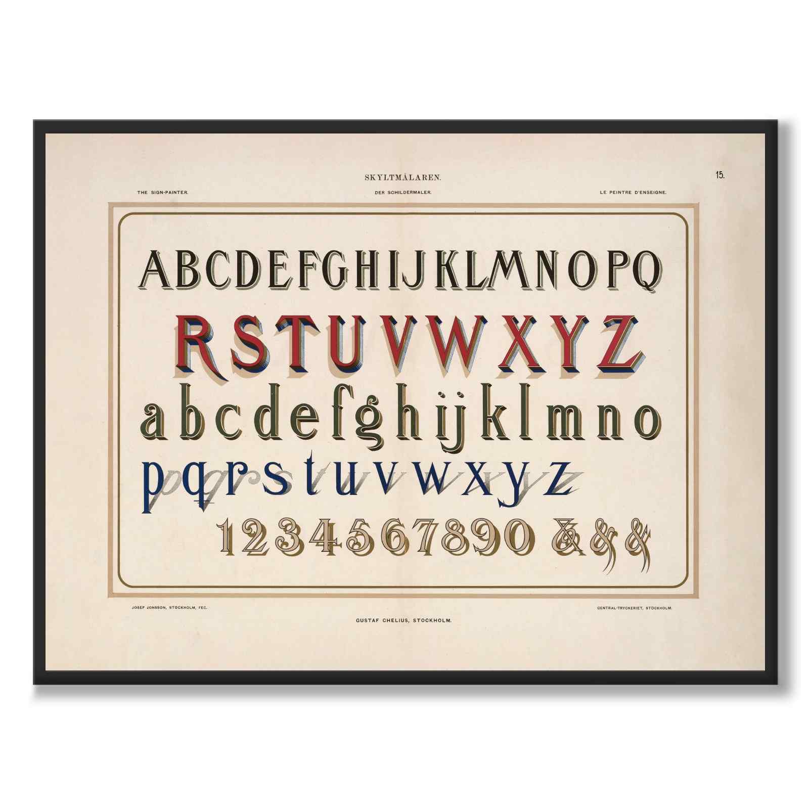 Poster med en gammal illustration från 1899. På bilden ser vi alfabetet skrivet i vacker tidstypisk typografi. Här syns också olika tekniker för att skapa skuggor bakom bokstäverna vilket var vanligt runt sekelskiftet.