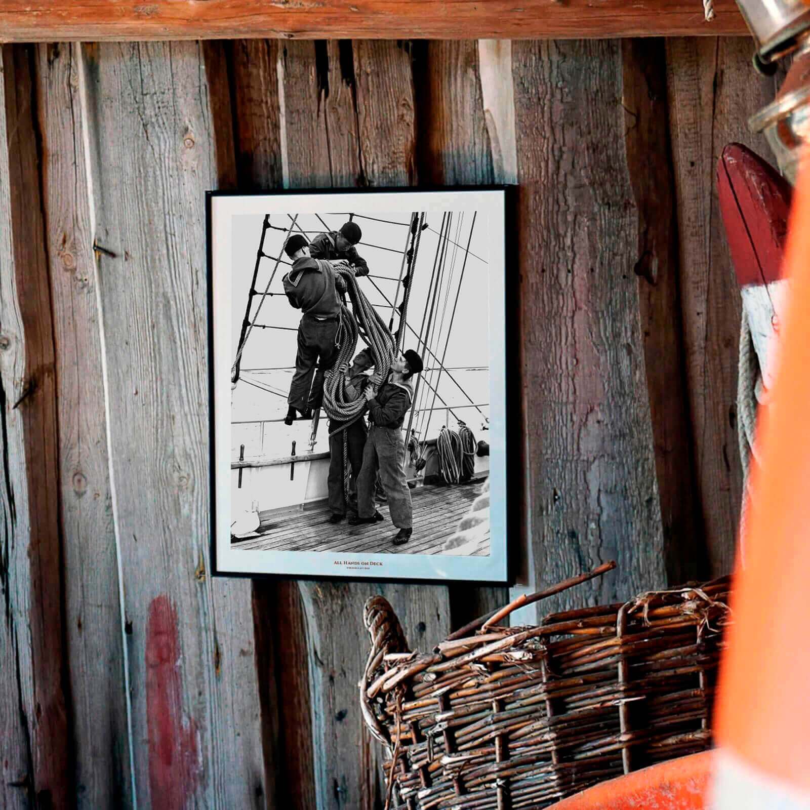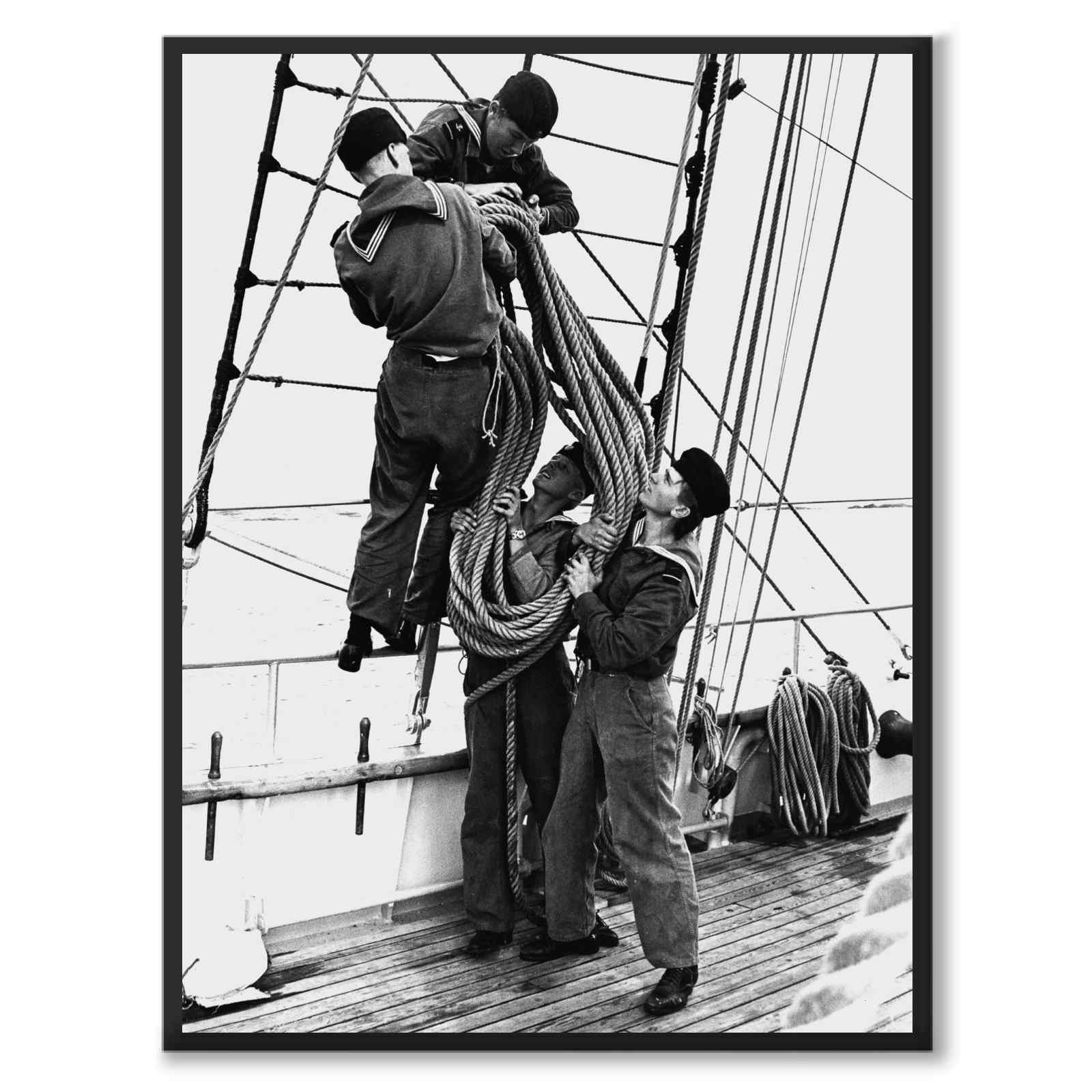 Fyra stiliga kadetter försöker lyfta ett rep på en av svenska flottans skolskepp år 1968. Skolskeppet är antingen Gladan eller Falken. Skeppen användes bland annat för att utbilda sjöofficerare.