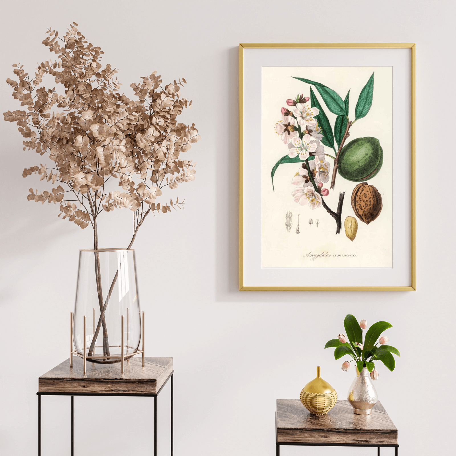 Poster med vacker, botanisk illustration av ett mandelträd från 1800-talet. Amygdalus communis är den botaniska benämningen för mandelträdet och dess frukter.
