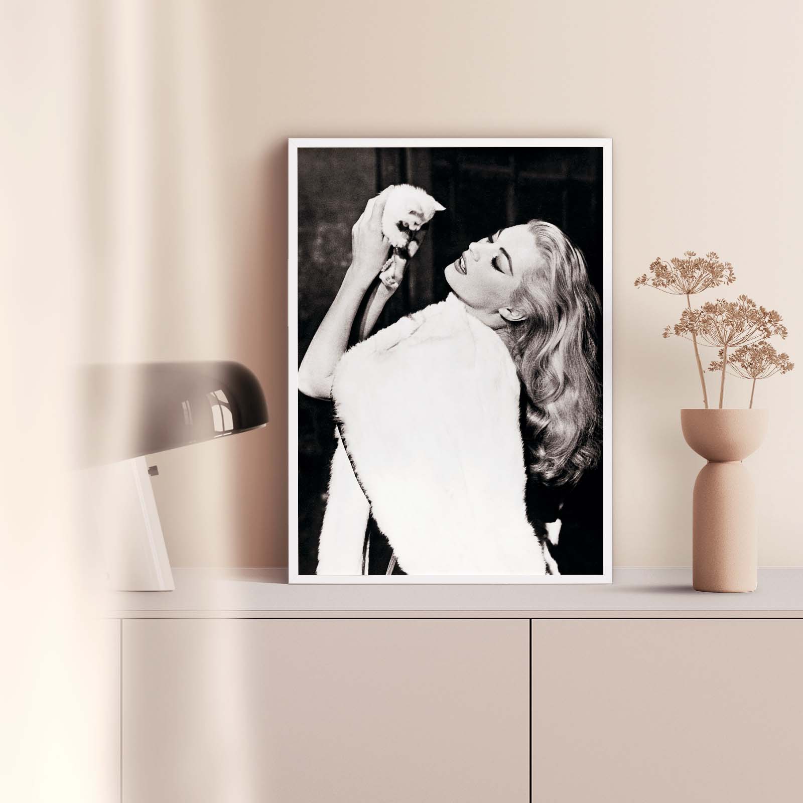 Poster med en unik bild på Anita Ekberg och en vit kattunge år 1960.