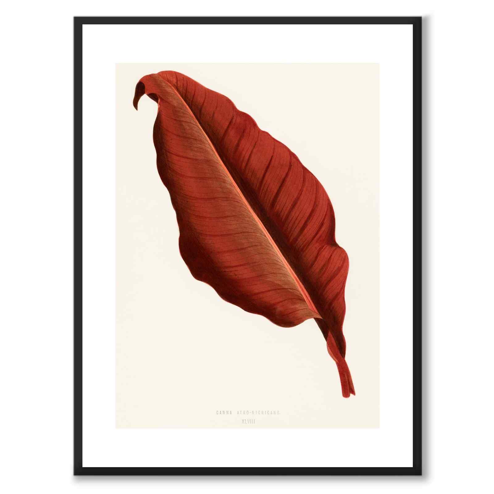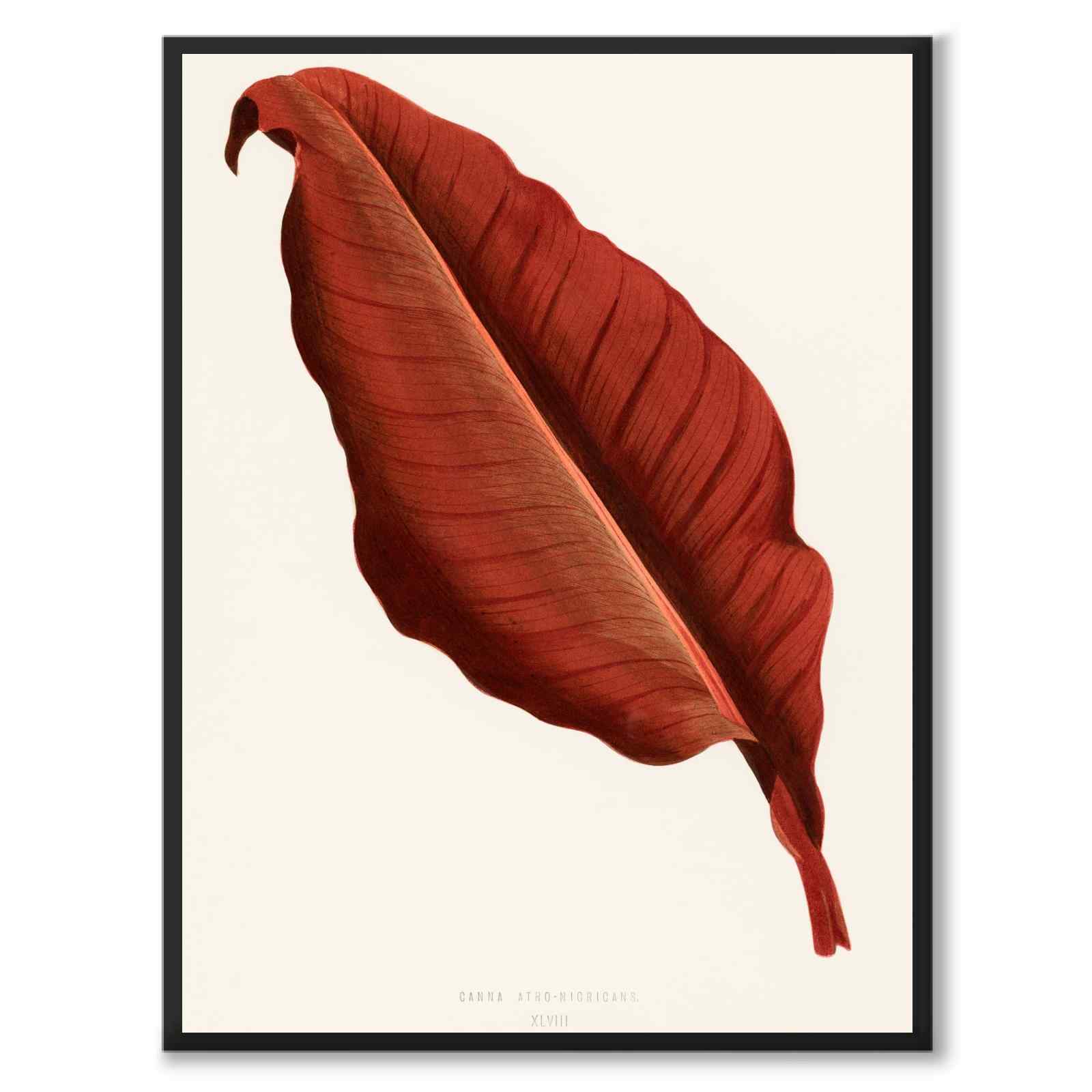 Poster med ett vackert blad från en Indian Canna (Canna Atro Nigricans), känd för sina stora rödaktiga blad. Verket publicerades i boken "Beautiful Leaved Plants" av Shirley Hibberd år 1870.