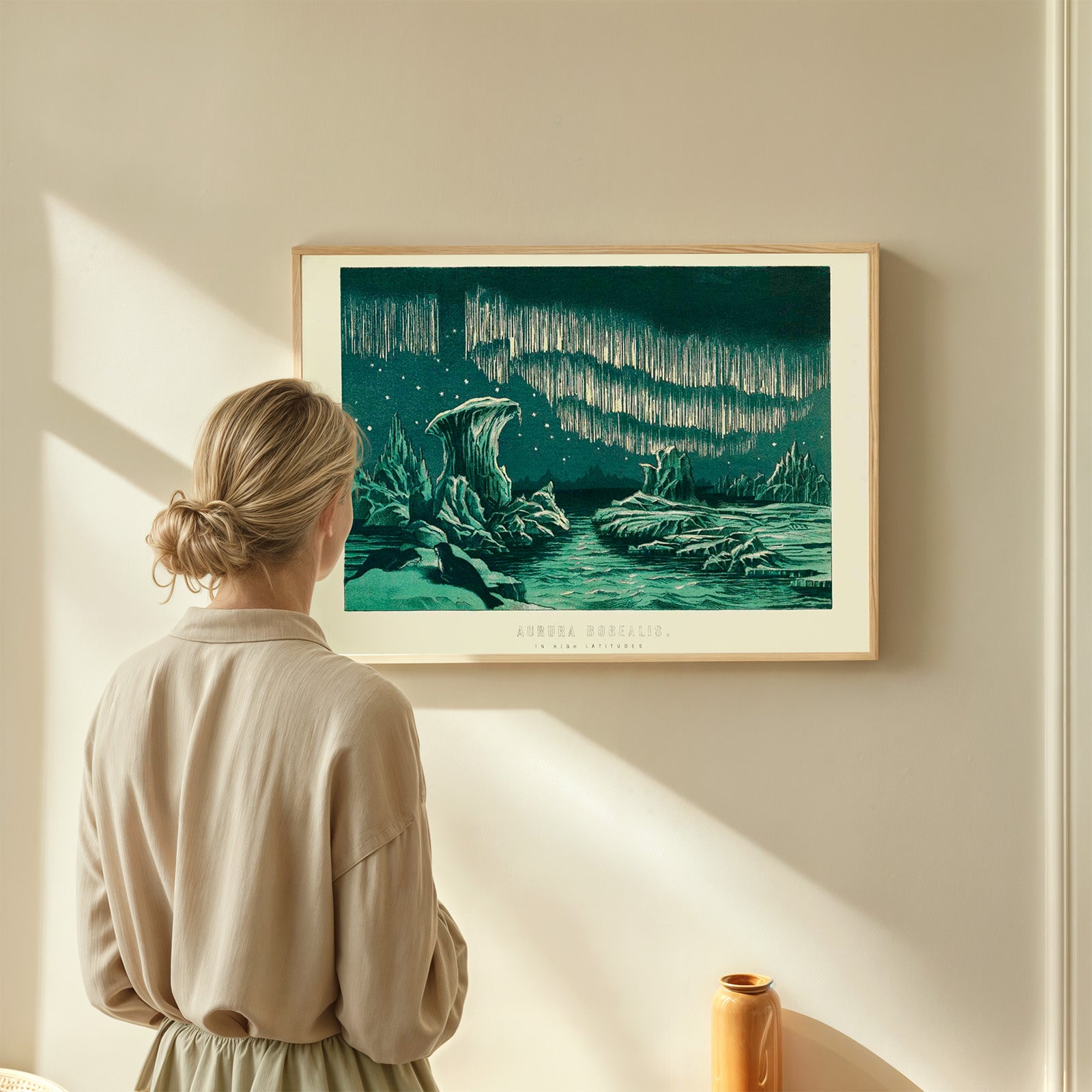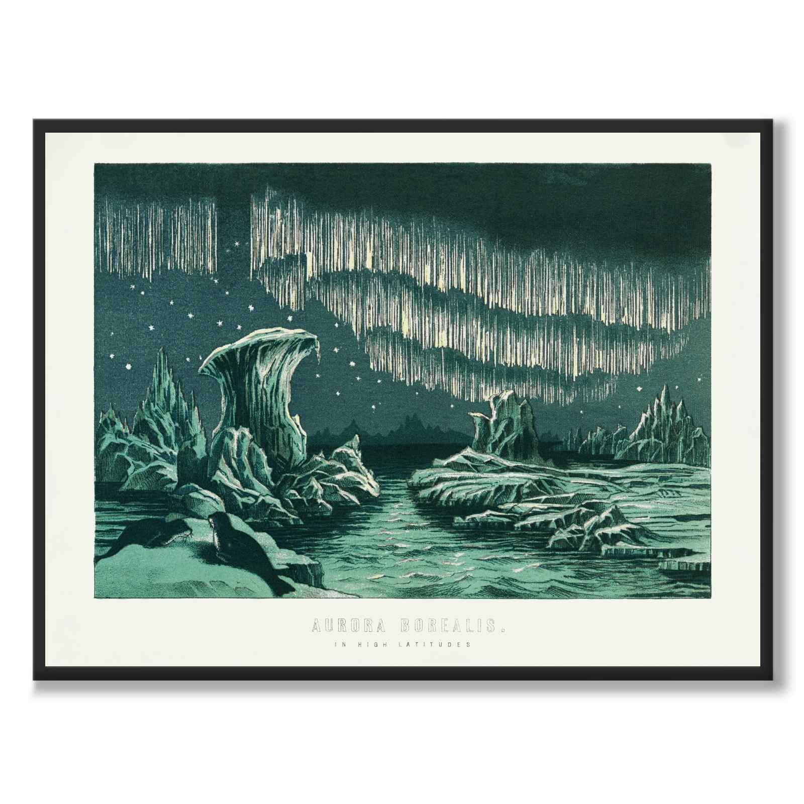 Poster med en vacker illustration av norrsken. Under bilden ser vi titeltexten Aurora Borealis - In High Latitudes. Bilden kommer ifrån boken "William MacKenzie’s National Encyclopedia", publicerad år 1891 i Storbritannien.