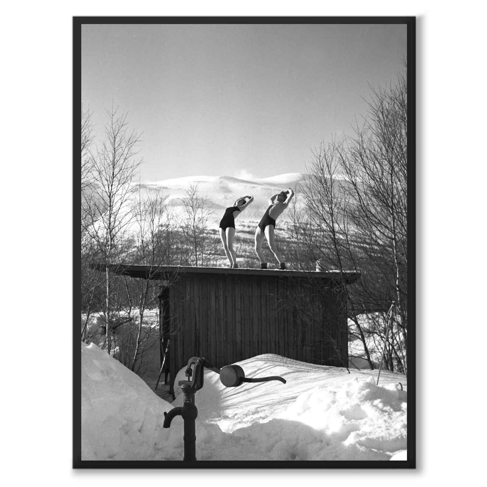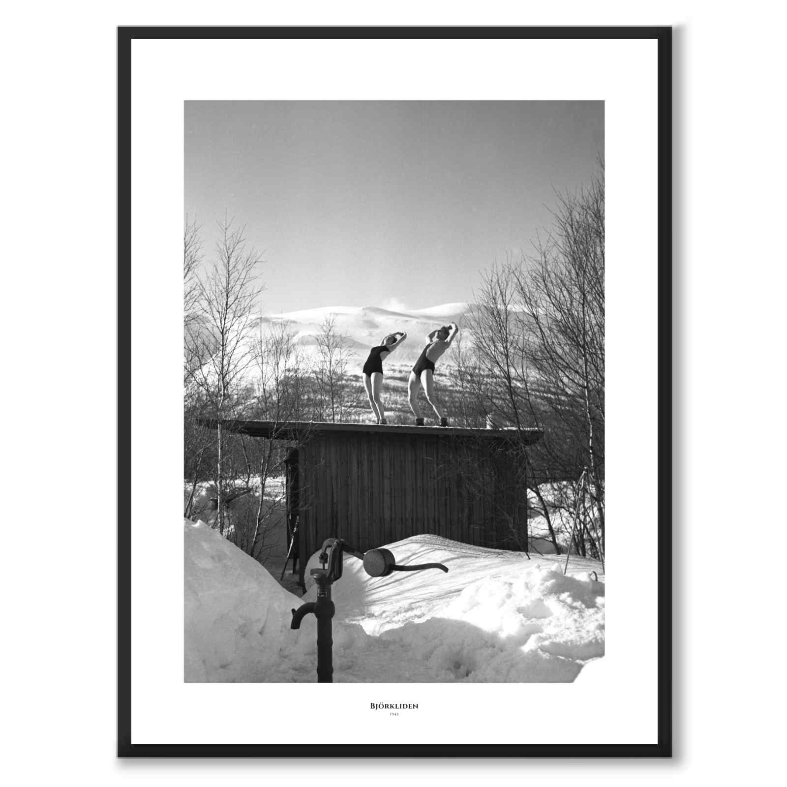 På fotot ser vi Iris och Bertil Thorelli som gymnastiserar på taket till stugan i solskenet. Bertil är inkallad och gör militärtjänst i fjälltrakterna och han och frun bor i en av Björklidens stugor under den här perioden. De är båda klädda i tidstypiska baddräkter.