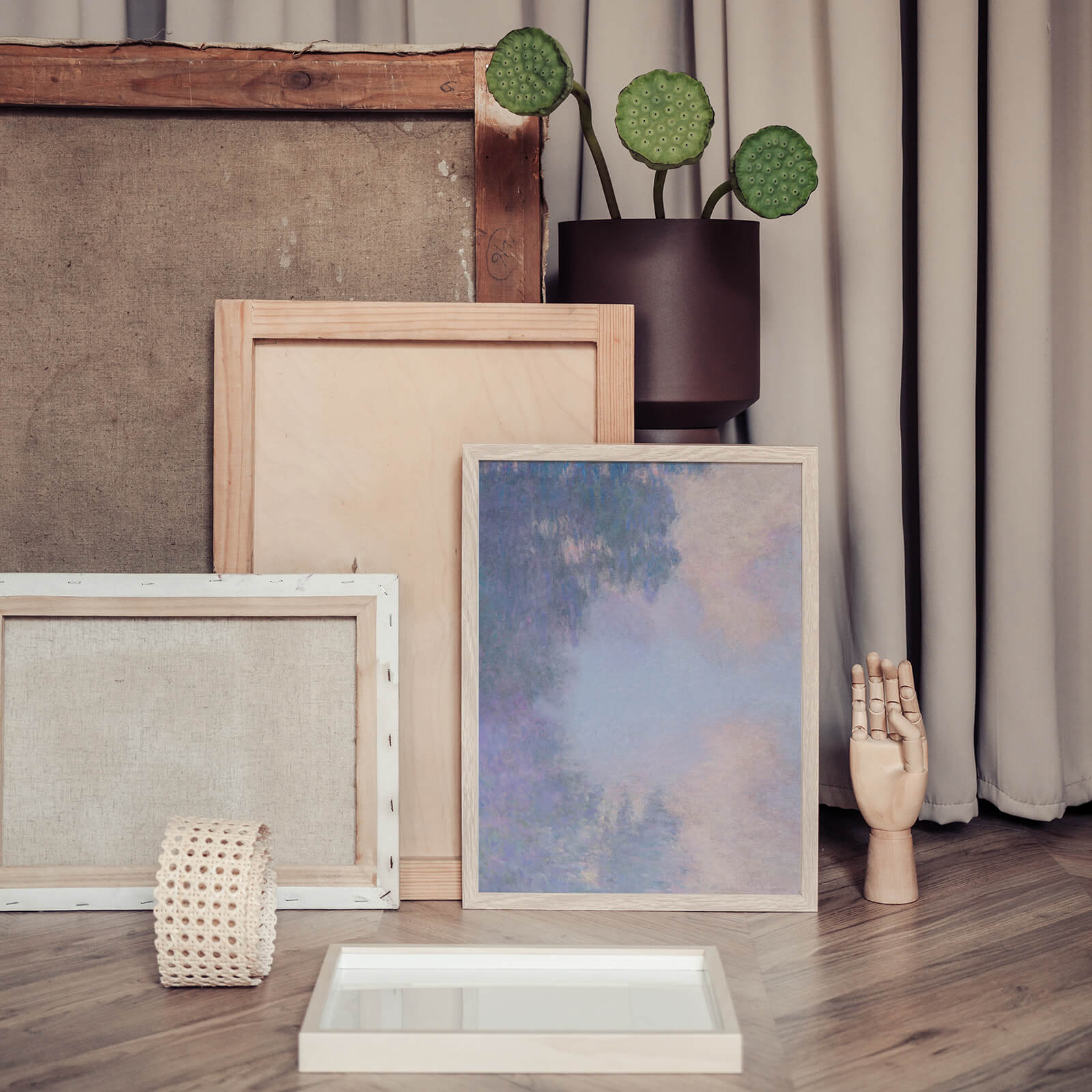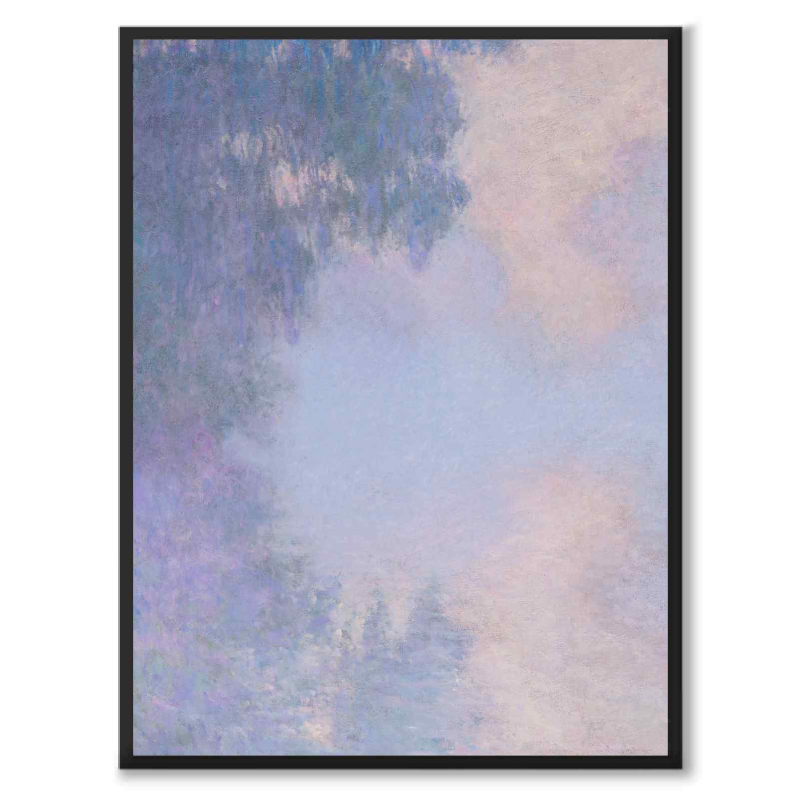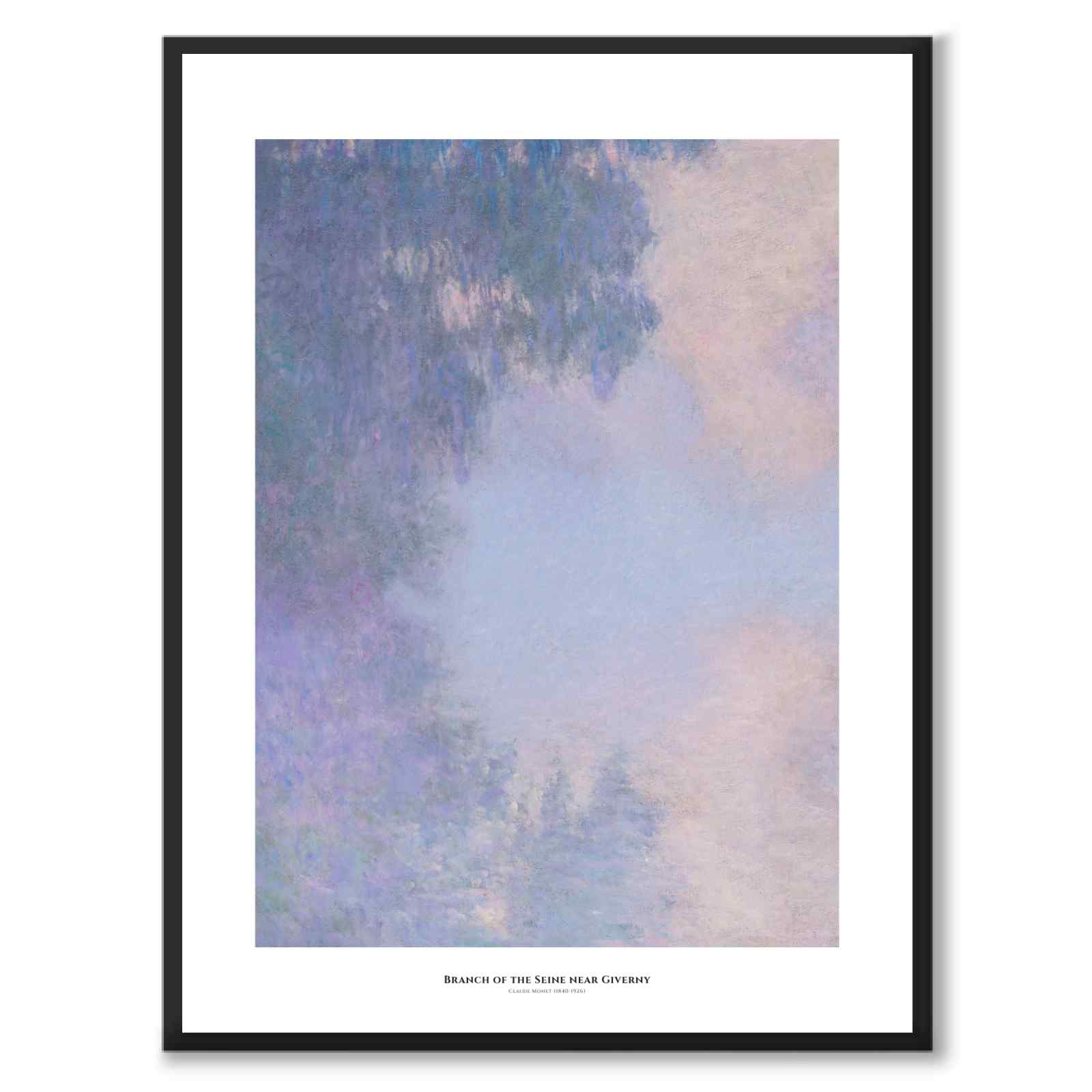 Poster med målningen Branch of the Seine near Giverny av Claude Monet från 1897. Monet målade 18 verk under sina morgonturer på floden Seine. Monet ankrade sin flatbottnade båt på flodbanken och målade flera verk när ljuset skiftade mellan soluppgång och morgon. För att hålla ordning på de olika verken så numrerade han dem och placerade dem i specialbyggda fack inuti båten.
