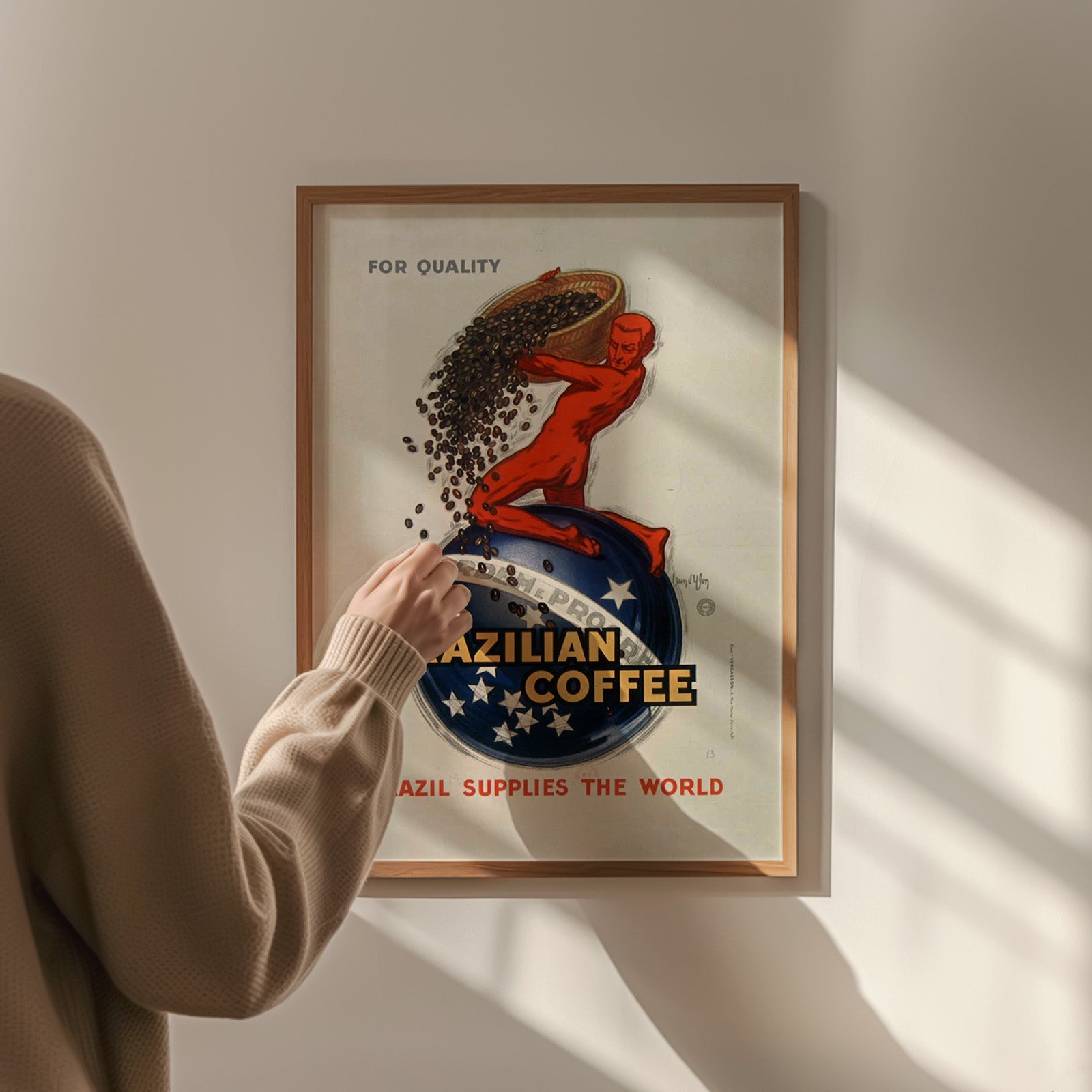 I bilden ser vi texten For quality, drink Brazilian coffee – Brazil supplies the world. En röd man häller ut kaffebönor på en blå glob med vita stjärnor på. Symboliken i bilden är Brasilien som en ledande distributör av kaffe i världen.