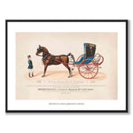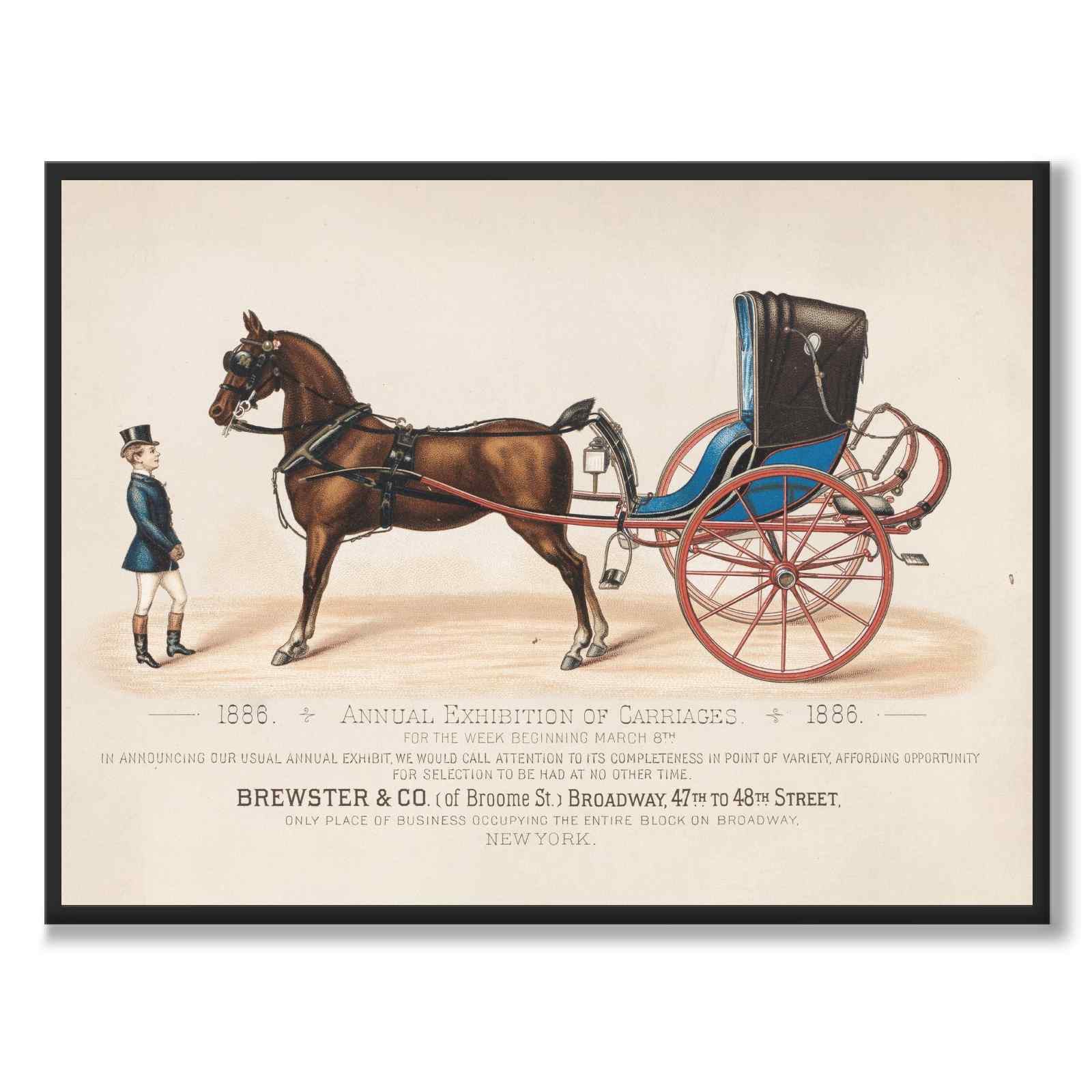 Poster med en vintage affisch för Brewster & Co. Annual Exhibition of Carriages från 1886. På affischen ser vi en stilren illustration av en man samt en häst med vagn.