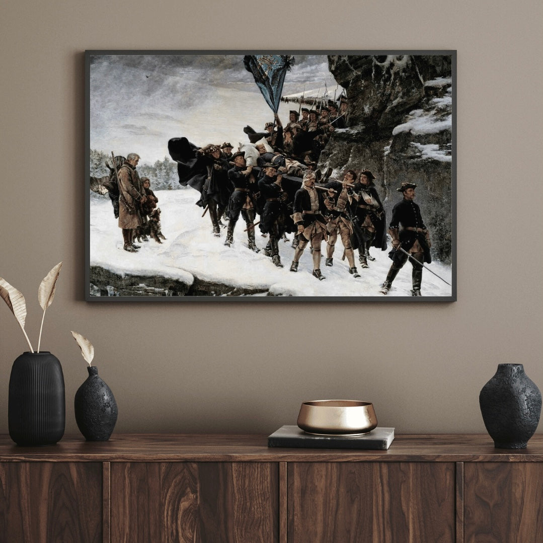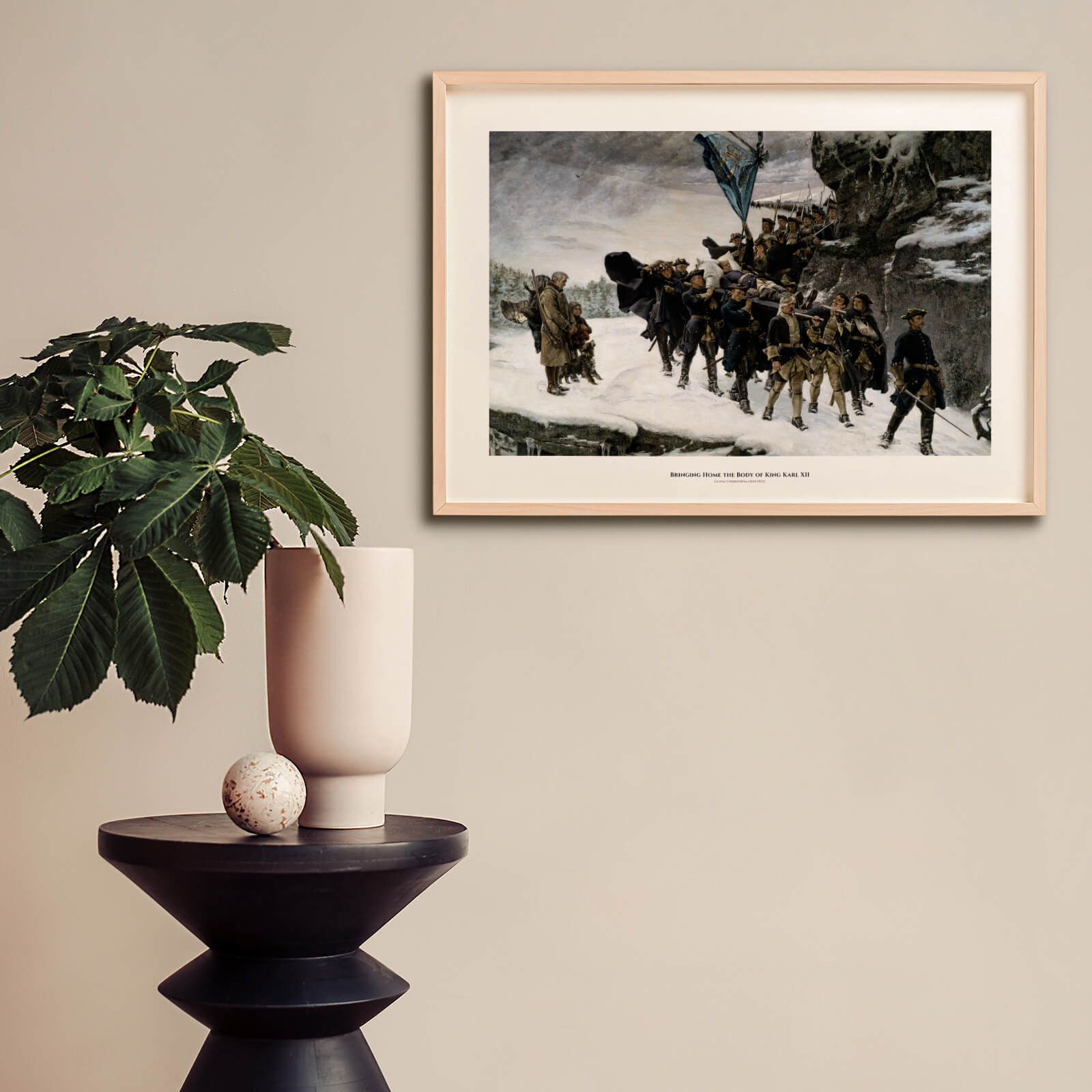 Poster med målning av Gustaf Cederström från 1884 föreställande Karl XIIs likfärd. Tavlan visar en fiktiv scen där den avlidne Kung Karl XII bärs hem av sina soldater efter att ha skjutits vid slaget i Halden i Norge 1718.