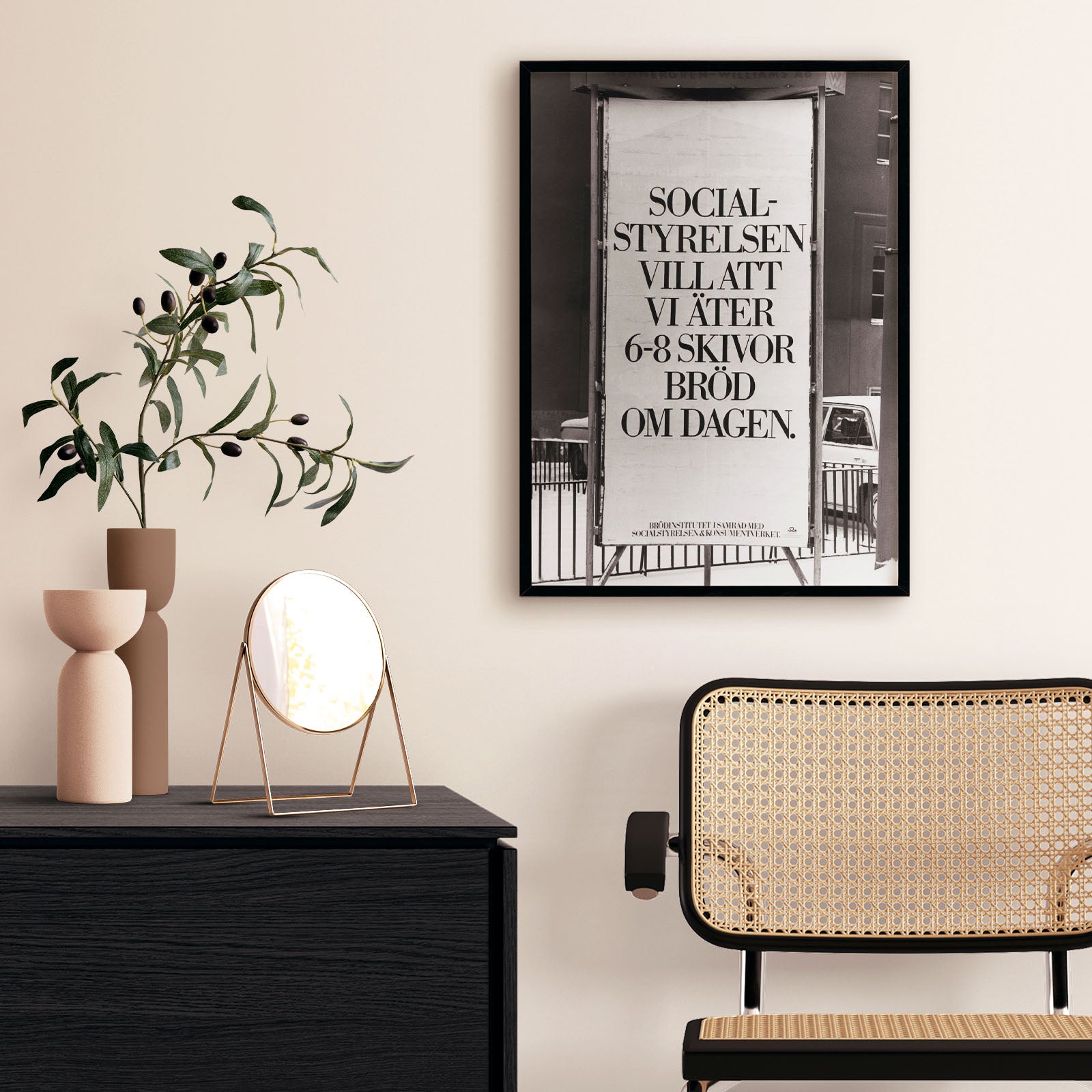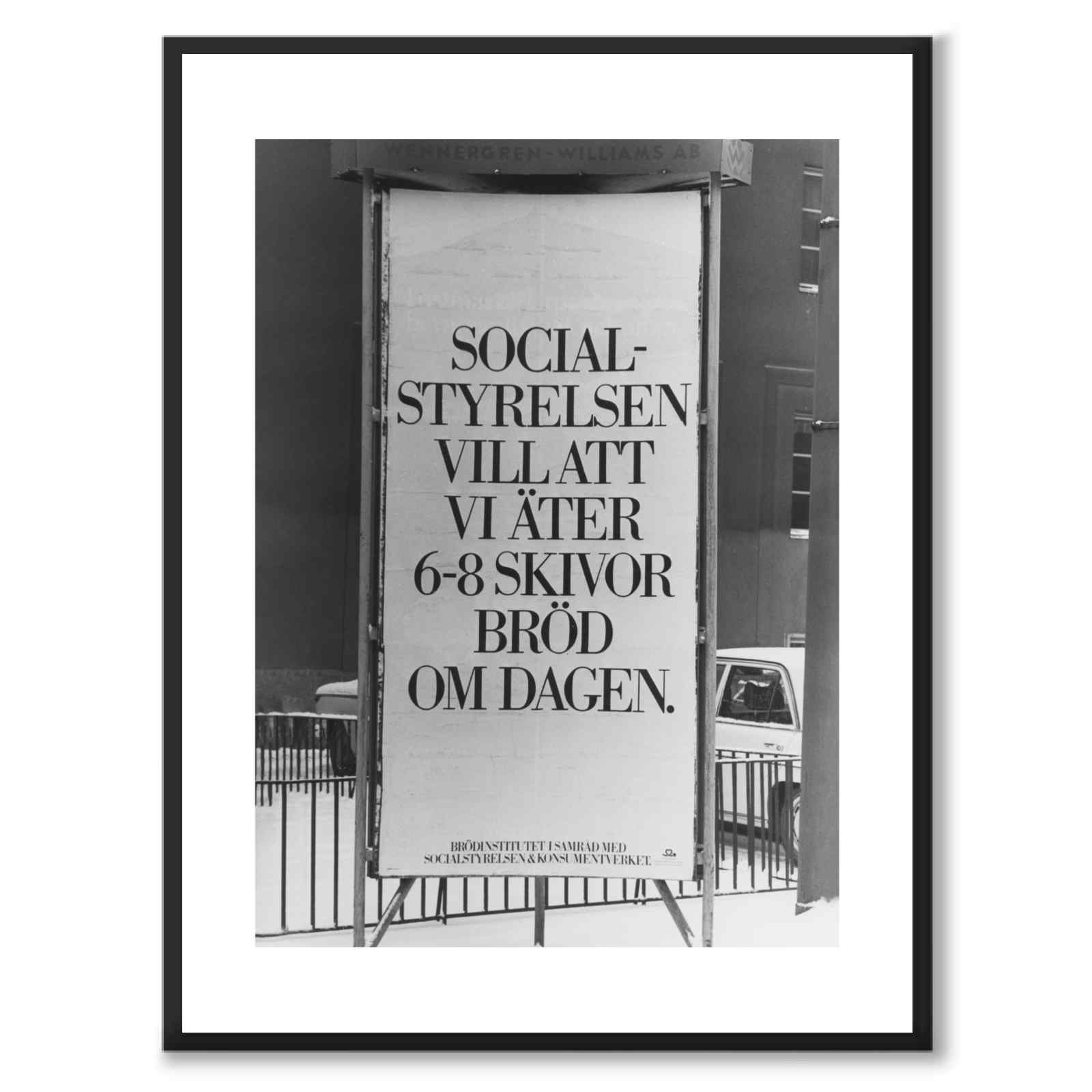 Poster med en rolig reklamkampanj från Sverige år 1976. En reklampelare basunerar ut budskapet: "Socialstyrelsen vill att vi äter 6-8 skivor bröd om dagen". Kampanjen är dock inte statlig eller från Socialstyrelsen utan från Svenska Brödinstitutet.