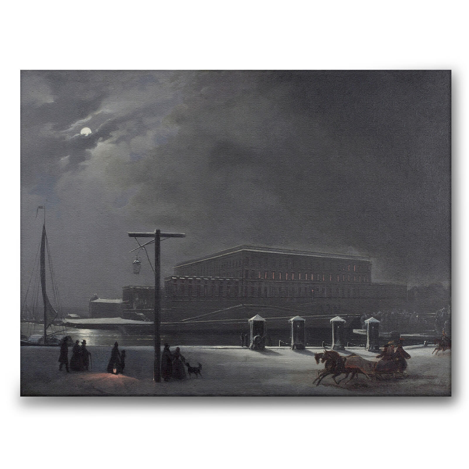 Canvastavla med en målning från 1843 av den franska konstnären Justinien Clary. Justinien var i Stockholm för att hälsa på sin faster, drottning Desideria, gift med Kung Karl XIV Johan. Justinien målade drottningens hem i Sverige från andra sidan strömmen mitt emellan Kungsträdgården och Kungliga Operan. I drottningens våning på slottet ser man tända vaxljus som lyser. Vinterstaden med kyla, snö och fullmåne skapar en härlig och levande stämning.