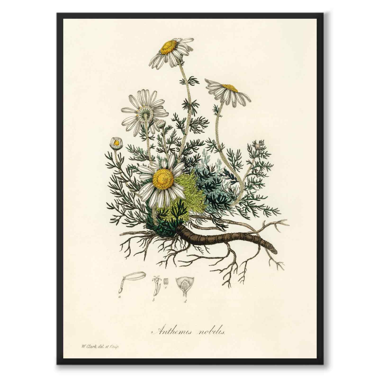 Poster med illustrationen Chamomile från 1800-talet. Kamomill är en allsidig växt som i århundraden har hyllats för sina medicinska egenskaper. Blommorna används vanligtvis för att brygga te, känt för sin lugnande effekt och för att främja avslappning och sömn samt minska ångest.