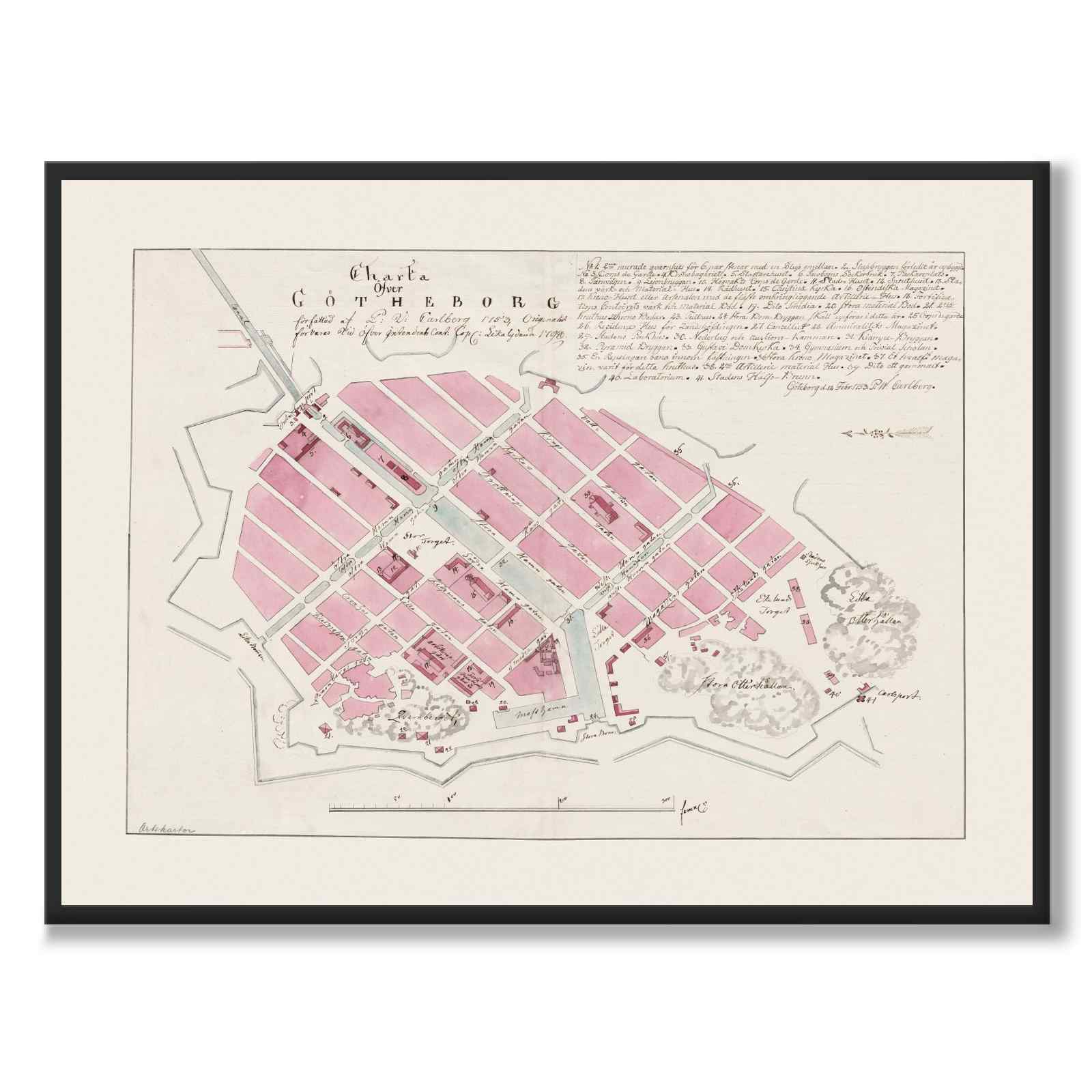 Poster med en gammal karta över Göteborg år 1798. På kartans övre kant ser vi texten: Charta öfver Götheborg : Författad af P. W. Carlberg 1753. Originalet förvaras vid Öfver intendents Cont. Cop. likalydande 1798.