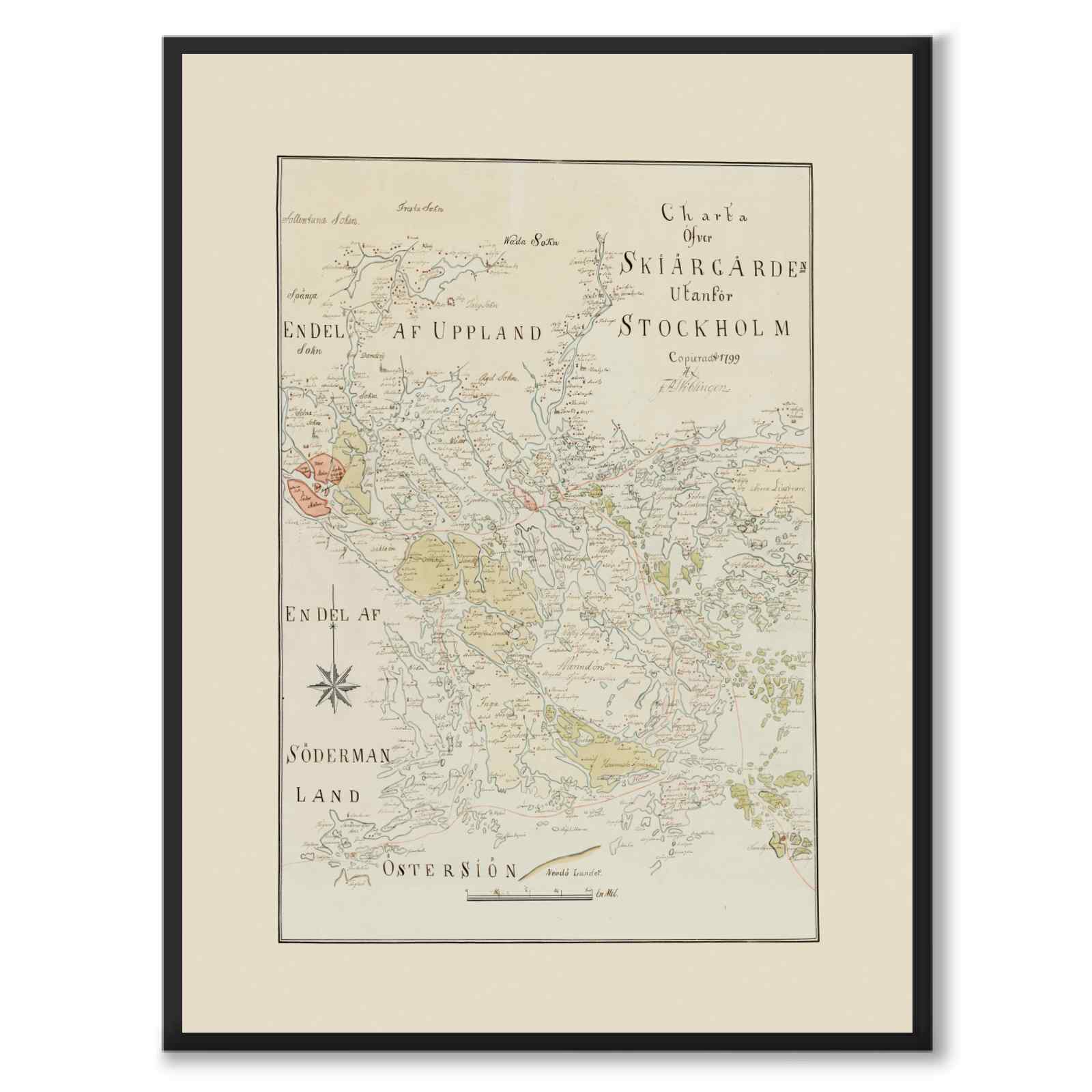 Poster med en vackert illustrerad "Charta öfver skiärgården utanför Stockholm". Den detaljerade kartan över Stockholms skärgård är handritad av Fredrik Adolf Wiblingen år 1799.