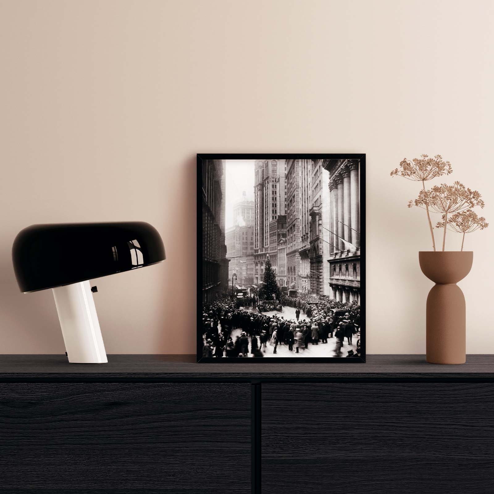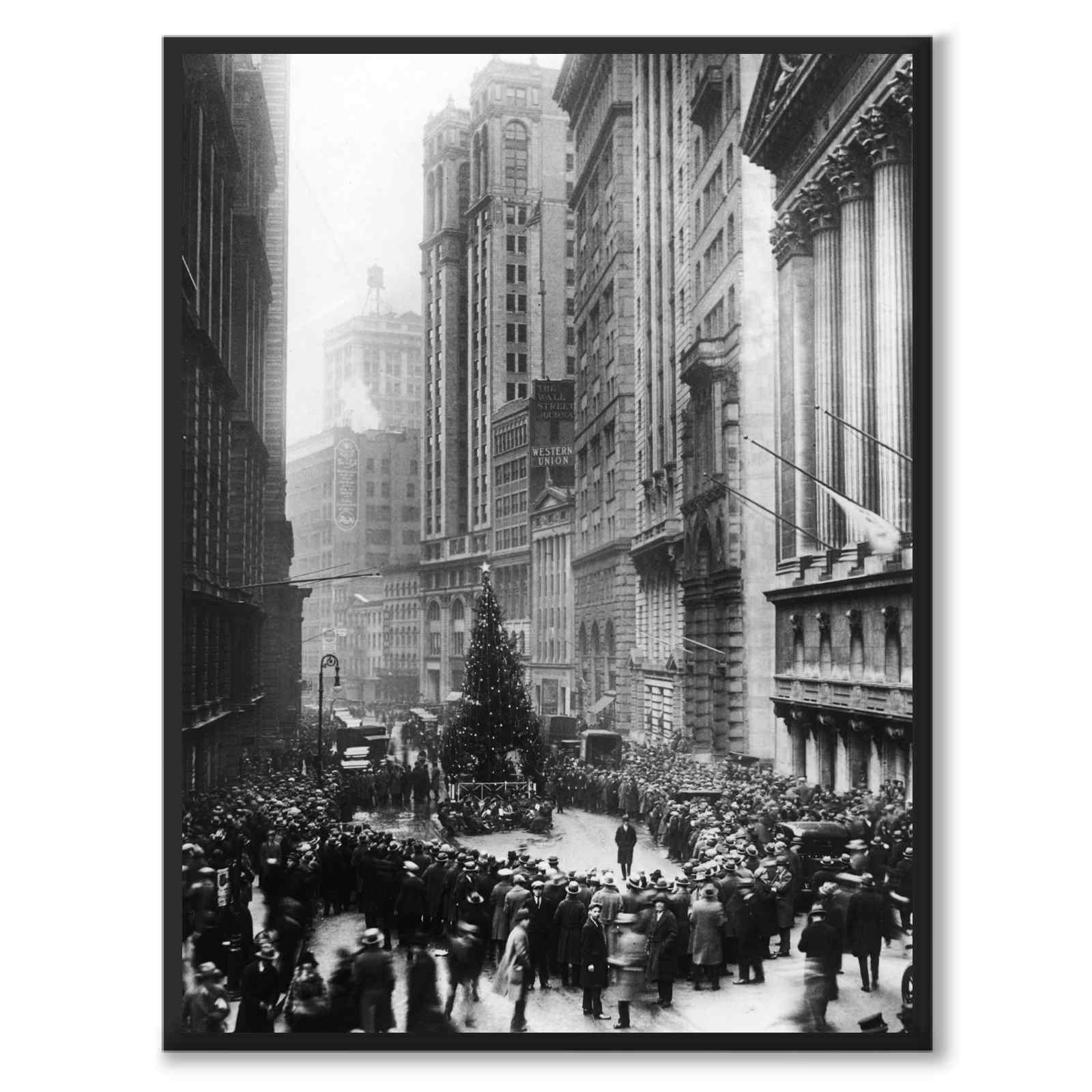 Poster med en bild från New York den 26e december år 1925. En stor julgran står mitt på finansgatan Wall Street i New York och människor har samlats för att lyssna på bandet som sitter vid granen. Byggnaden till höger huserar New York börsen.