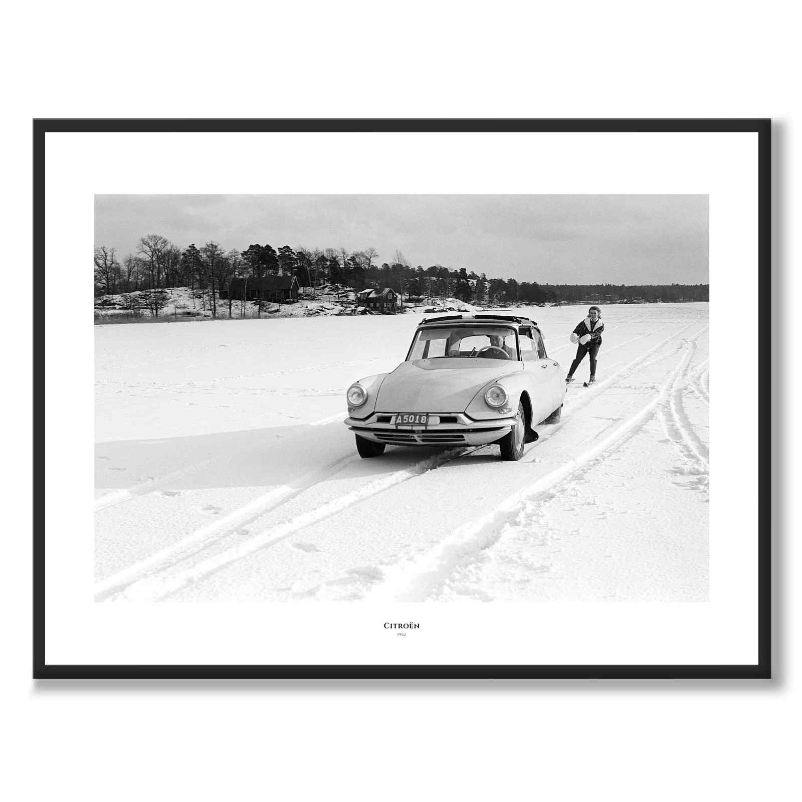 Poster med ett retro fotografi från 1962. På fotot ser vi en kvinna som åker skidor efter en Citroën i ett underbart snölandskap.