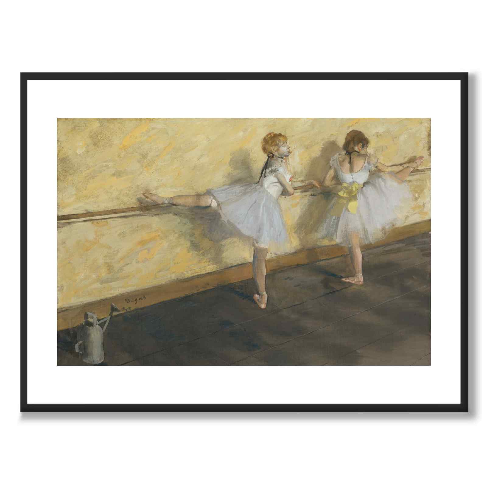 På bilden ser vi två ballerinor som tränar vid barren. Till vänster ser vi även en vattenkanna vilket var en standard i balettens replokaler; vatten stänktes på golvet för att hindra damm från att stiga upp när ballerinor dansade. Degas använde också vattenkannan som en visuell ordvits - dess form efterliknas av dansarens till höger.