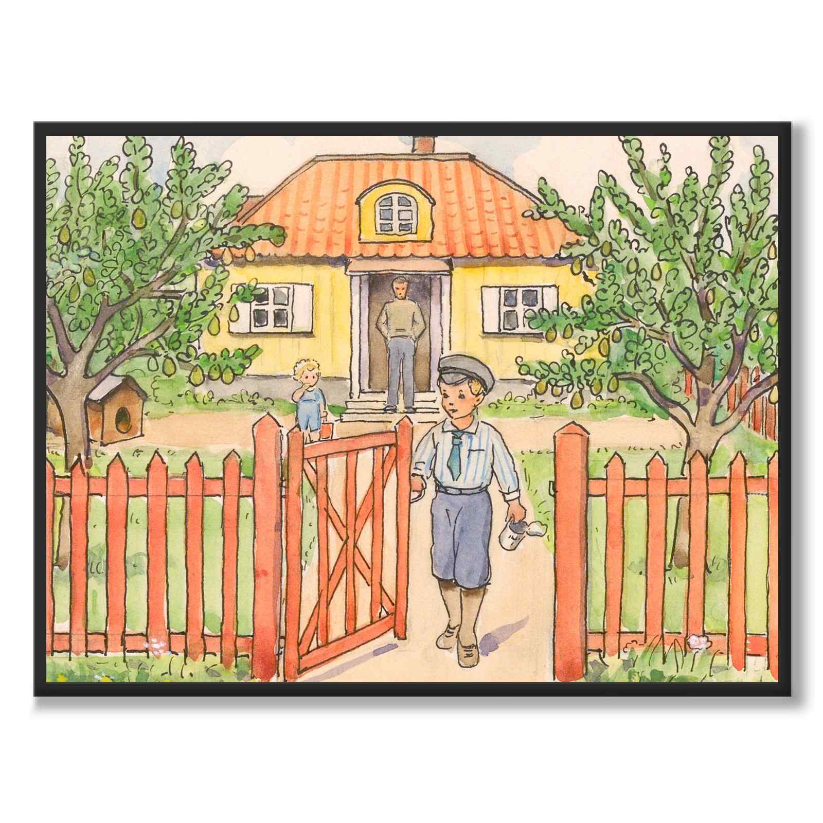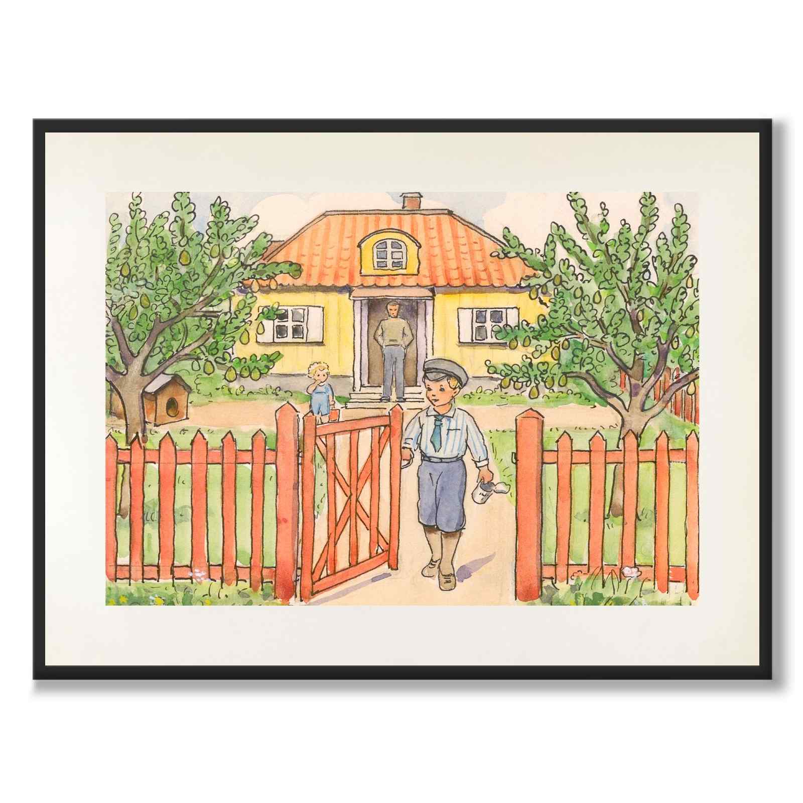 Bilden visar ett gult hus inhägnad av ett rött staket. En pojke i keps går ut genom den öppna grinden och håller en liten kanna i handen. I bakgrunden syns en vuxen person i dörröppningen och ett mindre barn på gårdsplanen. På tomten finns två stora träd och till vänster syns även ett litet hundhus.