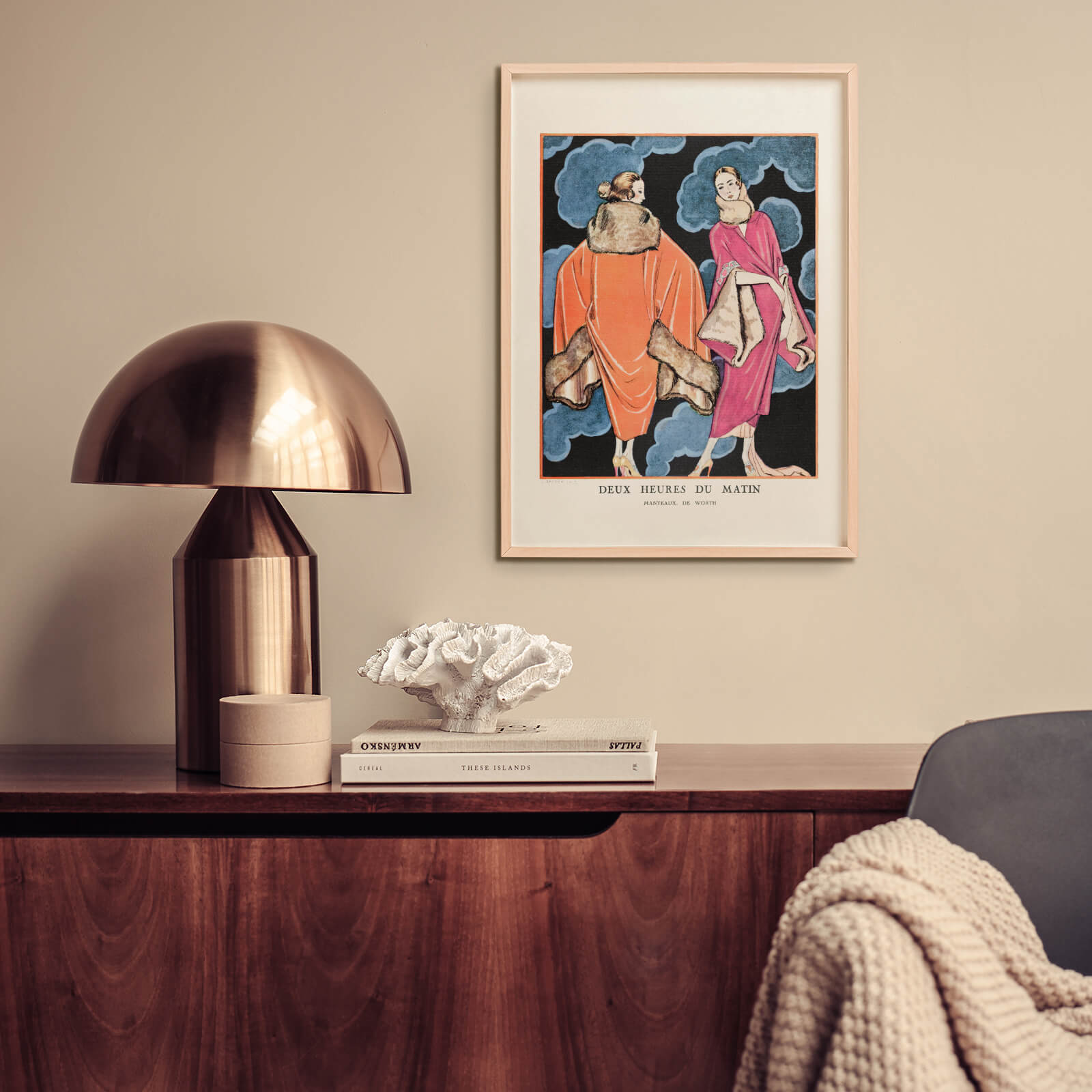 Illustratören hette George Barbier och var en mycket framstående konstnär från Frankrike hyllad av inte minst Vouge för hans bidrag till modevärlden under tidigt 1900-tal. Gazette du Bon Ton som illustrationen publicerades i var en av sin tids mest inflytelserika och exklusiva modetidning. Tidningen vittnade om de priviligerade kretsarnas bekymmersfria och flärdfulla livsstil. Mode var konst och Paris en teaterscen. Gazette du Bon Ton publicerade mode men även kåserier, noveller och kritik i en stil som var öppen för nya trender. De främsta couture-husen från tiden var Cheruit, Doucet, Lanvin, Paquin, Poiret, Redfern och Worth.