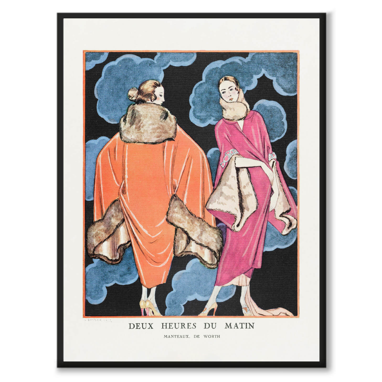 Illustration från franskt modemagasin år 1923. Ur illustrationen kan du läsa Deux heures de matin. Manteaux, de Worth - franska för Klockan två på natten. Kappor av Worth.