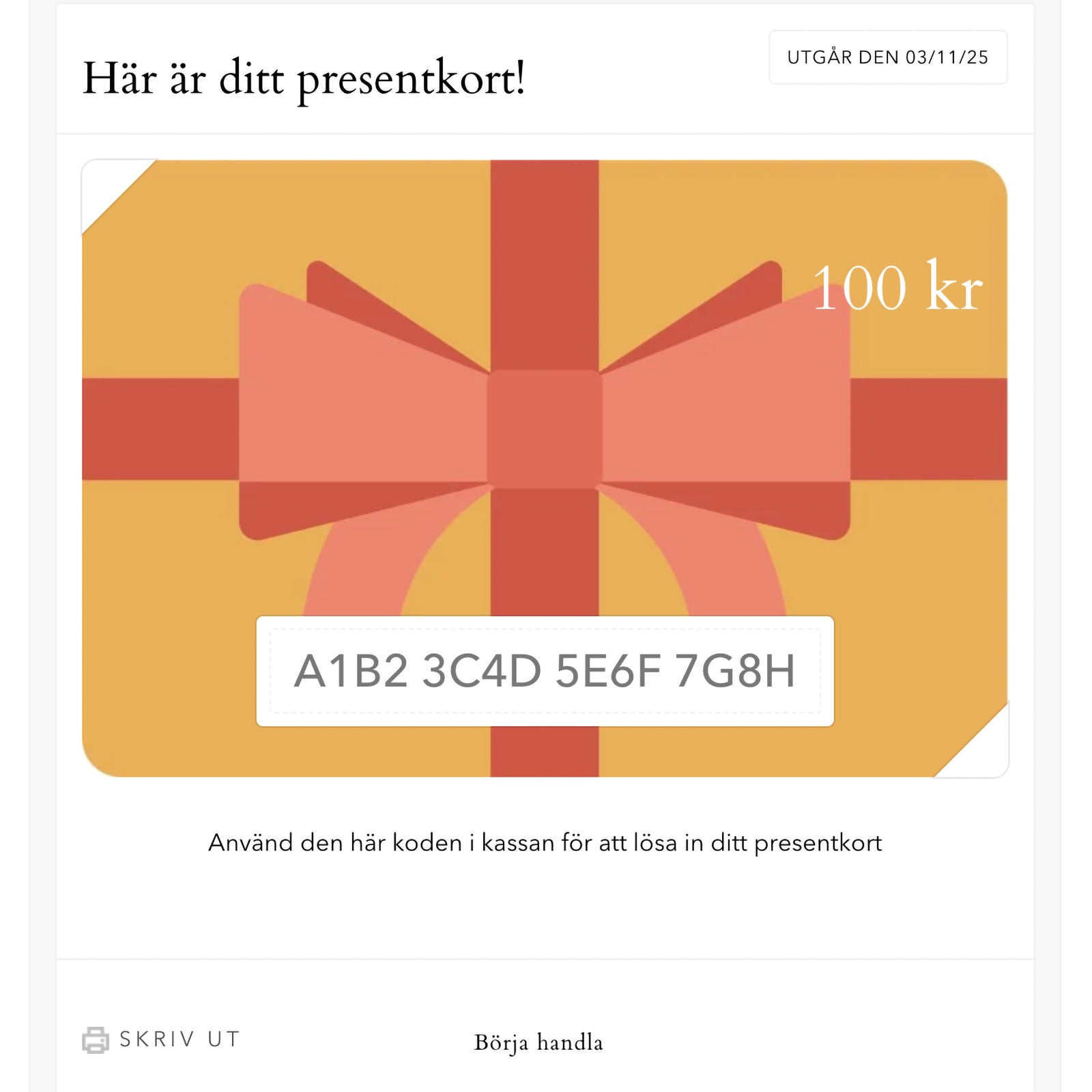 Mottagaren av presentkortet kan enkelt välja att lägga till presentkortet till sin Apple Wallet vilket gör det extra smidigt för honom eller henne! Våra presentkortet är alltid giltiga ett år från inköpsdatum.