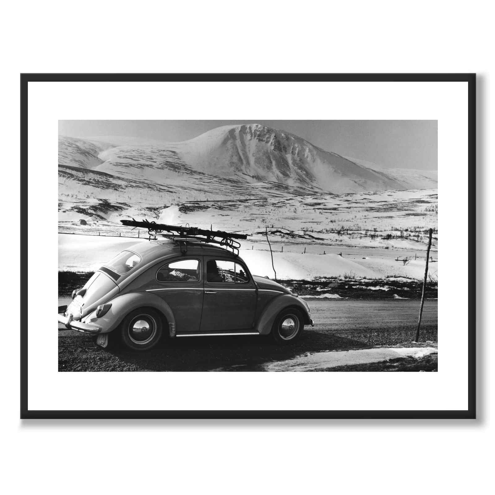 Poster med ett vintage fotografi av en bil åkandes vid Dovre - en norsk bergskedja. Dovres högsta punkt är Snøhetta, 2 286 meter över havet. Över Dovres fjällvidder går järnvägslinjen Dovrebanan från Oslo till Trondheim, liksom Europaväg 6 mellan Trelleborg och Kirkenes.