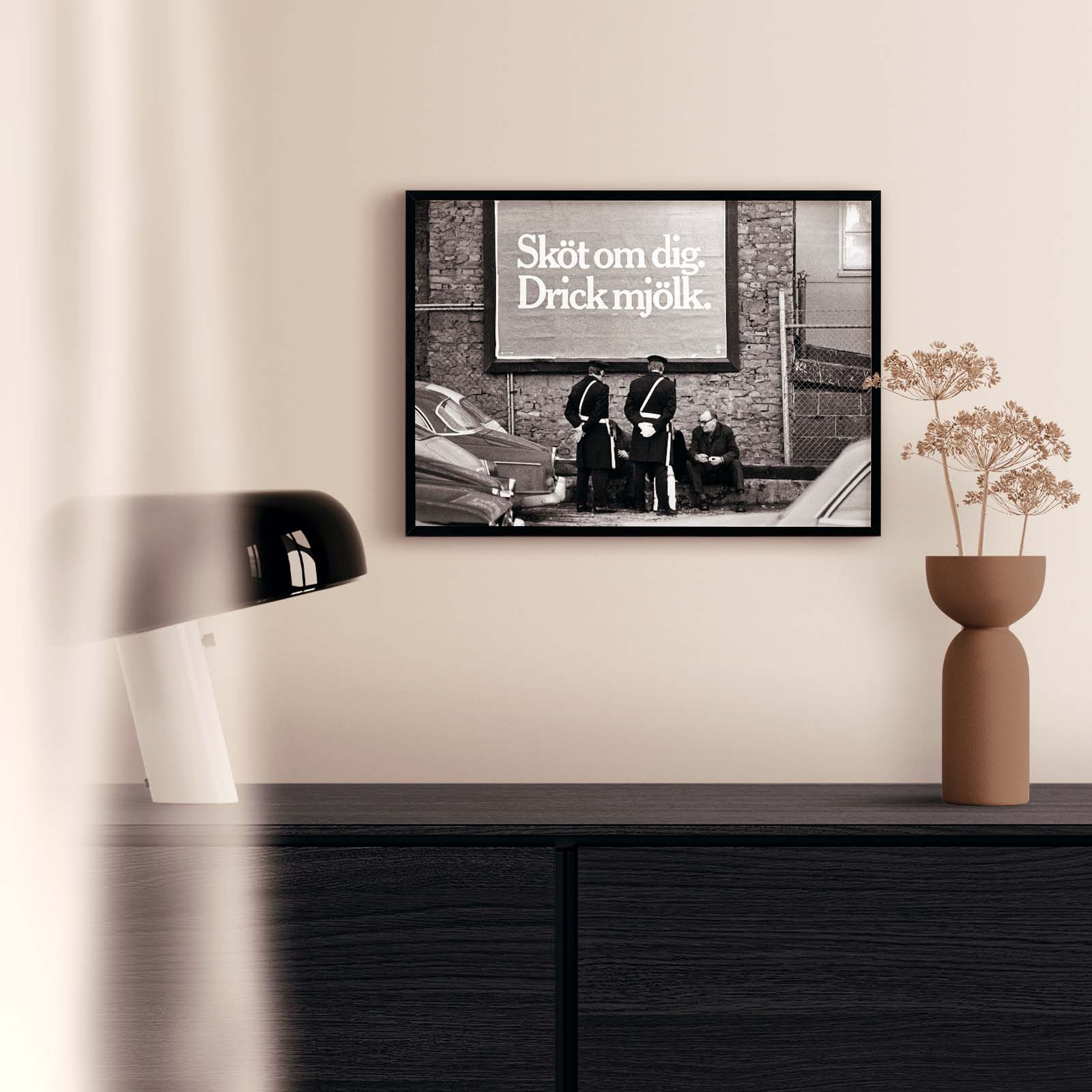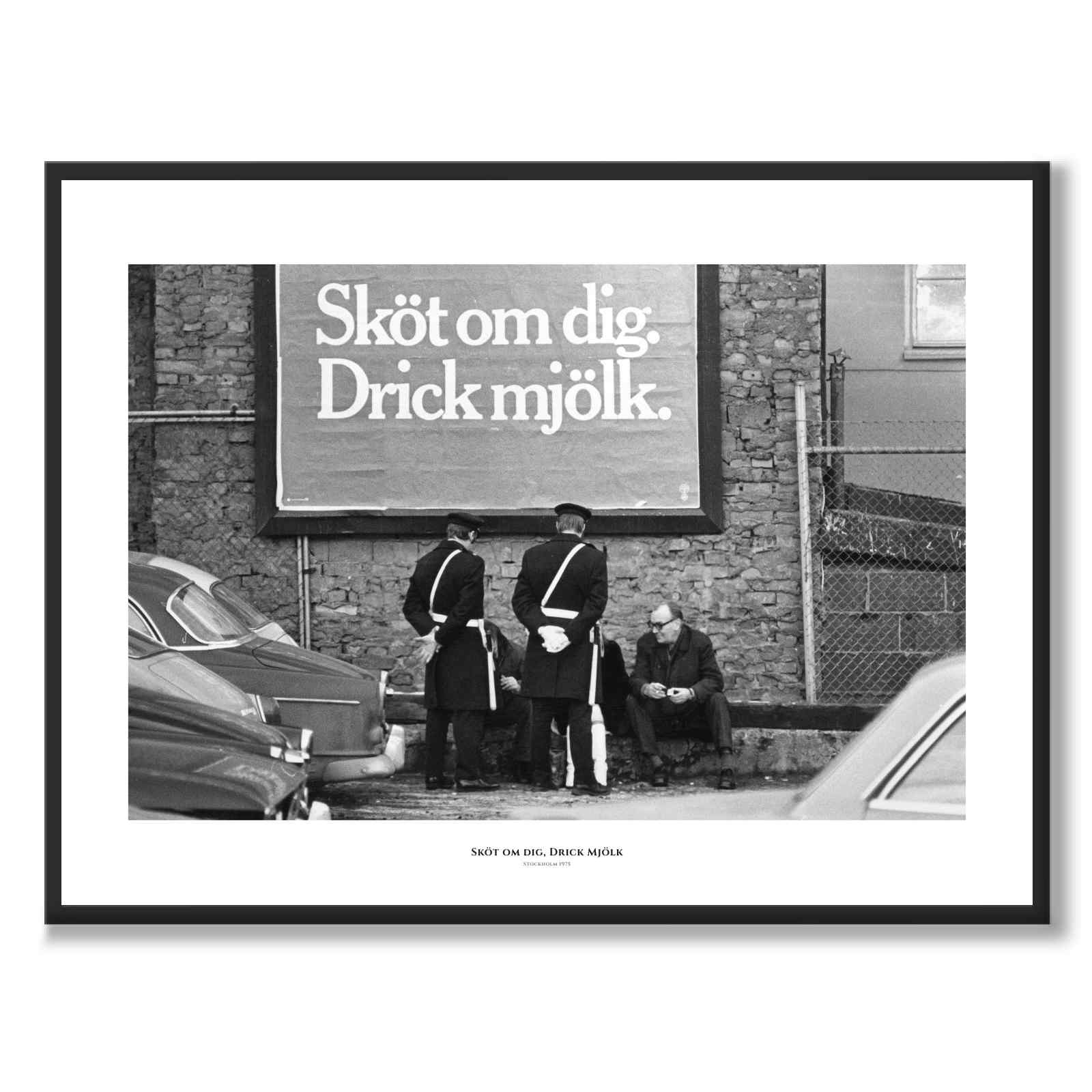 Uppmaningen på stortavlan på väggen bakom säger: Sköt om dig. Drick mjölk. Osäkert om de följer uppmaningen. En kampanj från Svenska mejerierna som publicerades i tidningsannonser och på stortavlor utomhus 1970.