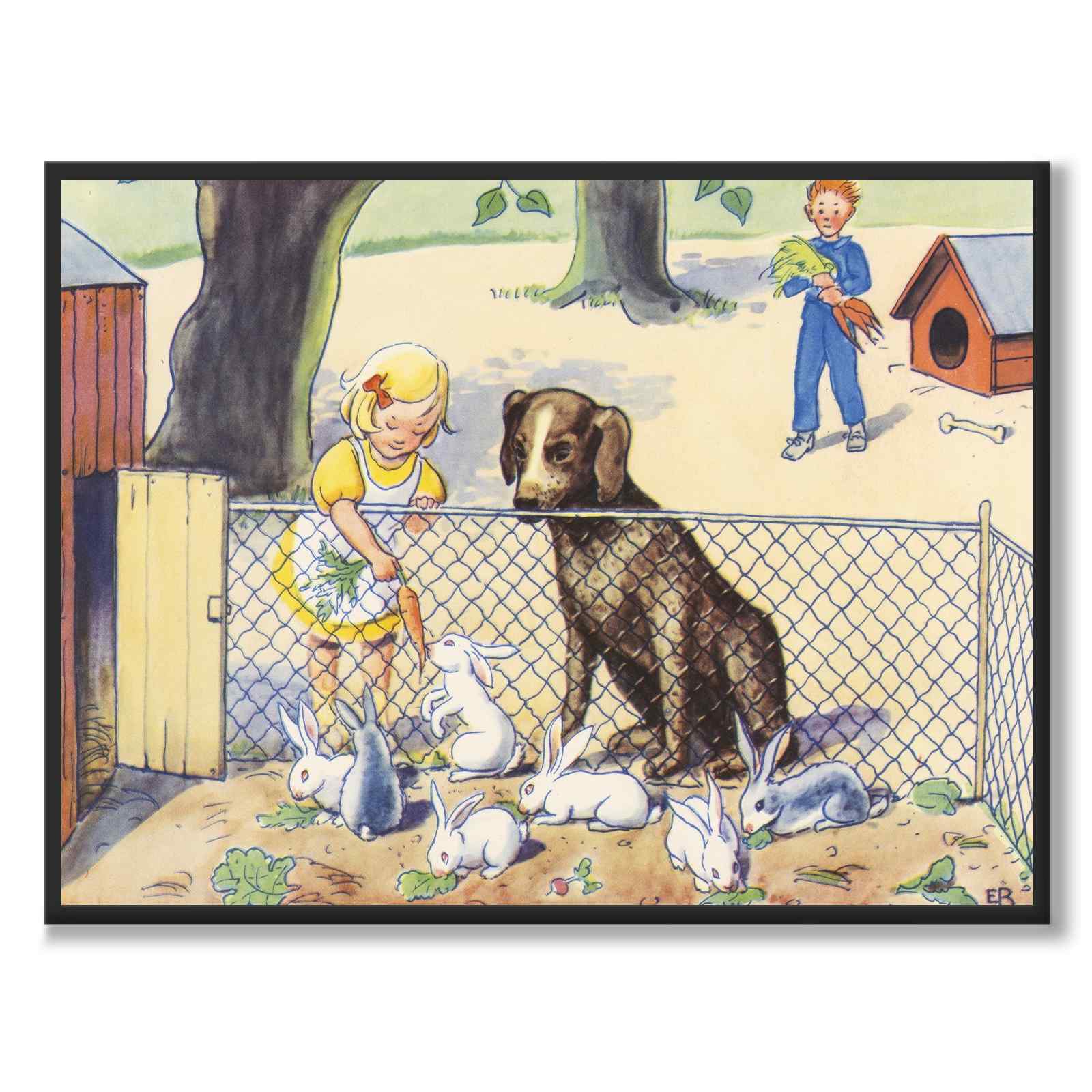 I denna illustration ser vi Annika som matar flera vita kaniner med en morot. Bredvid henne sitter en brun hund och i bakgrunden syns pojken Olle i blå kläder som är på väg med fler morötter.