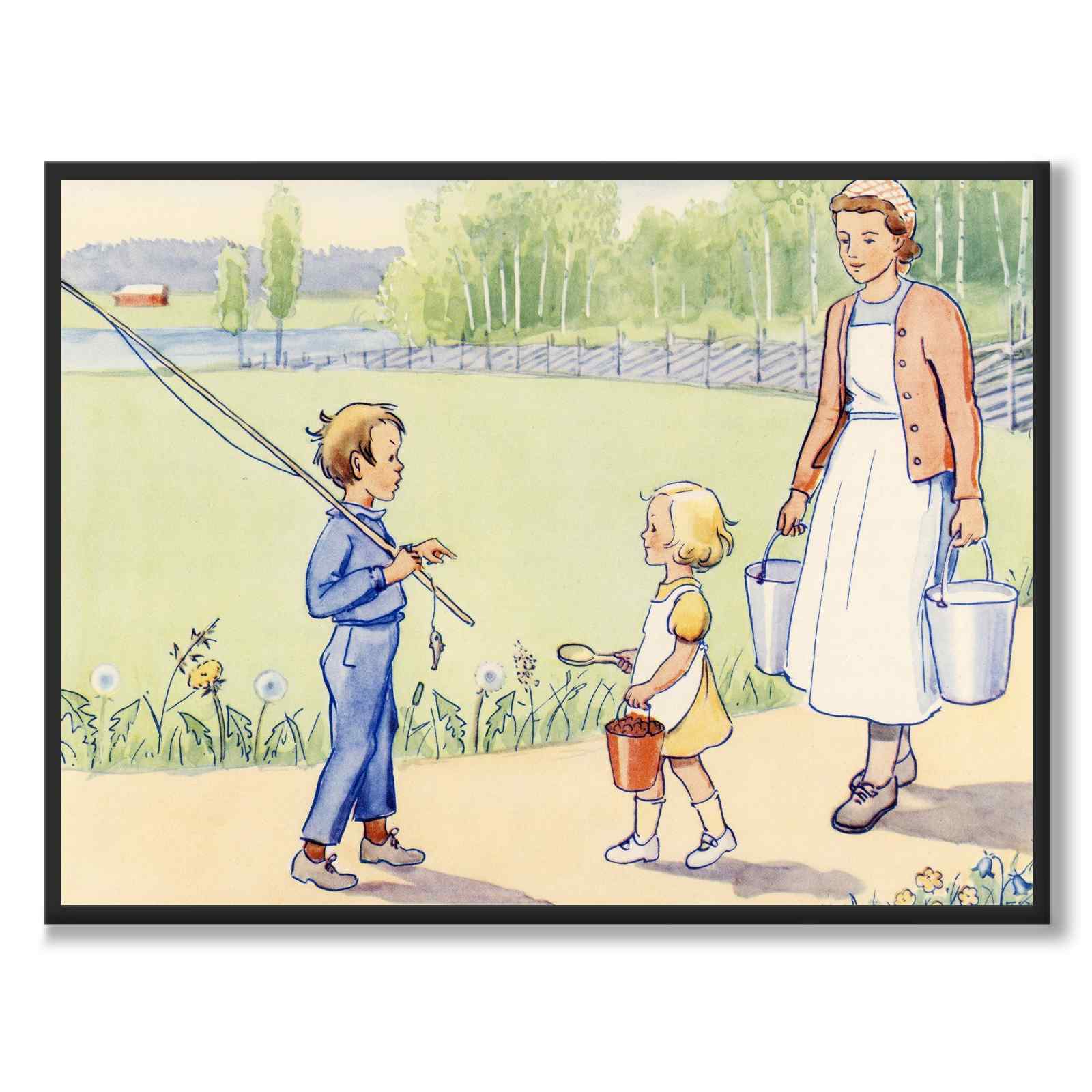 I denna illustration ser vi Annika som stöter på Olle, pojken i blå klädsel. Olle står med ett fiskespö och Annika håller i en röd hink. Bakom henne går en vuxen kvinna bärandes på två hinkar.