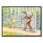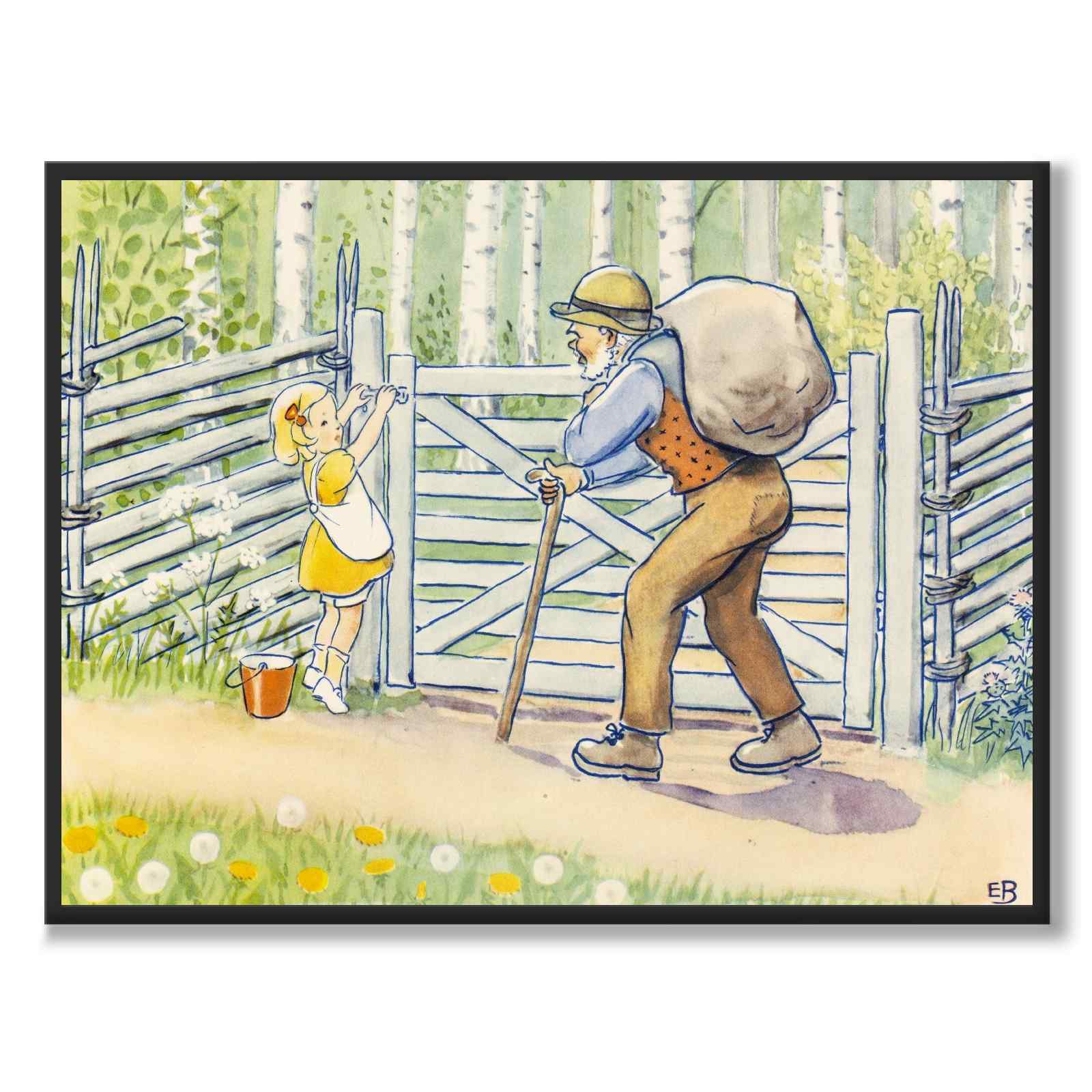 I denna illustration ser vi Annika som försöker öppna en grind, samtidigt som en äldre man med käpp kommer gåendes mot henne. Mannen har en stor säck på ryggen och verkar fånga Annikas uppmärksamhet.