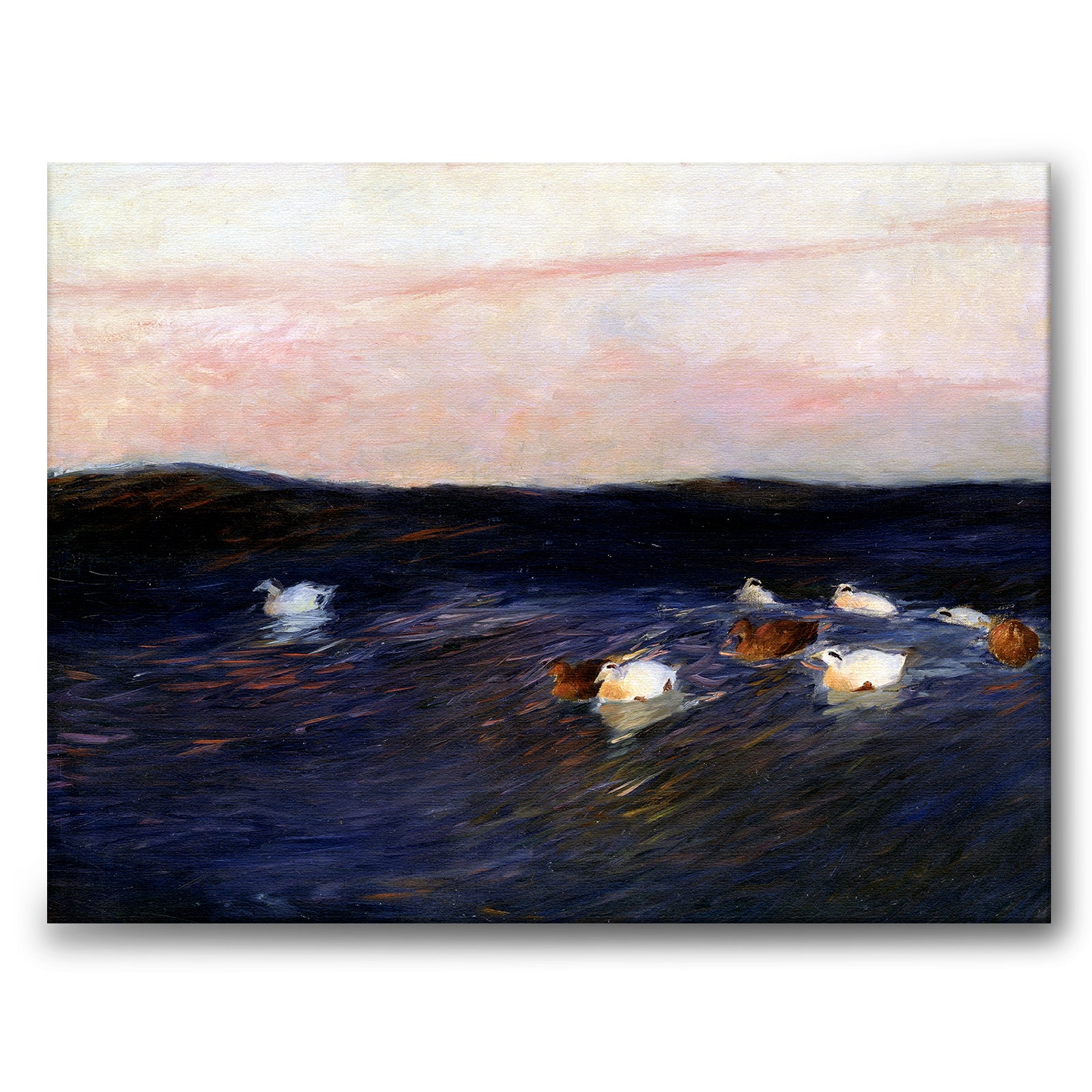 Canvas med en härlig målning av Bruno Liljefors föreställande en grupp Ejdrar i ett böljande hav under en rosa himmel.