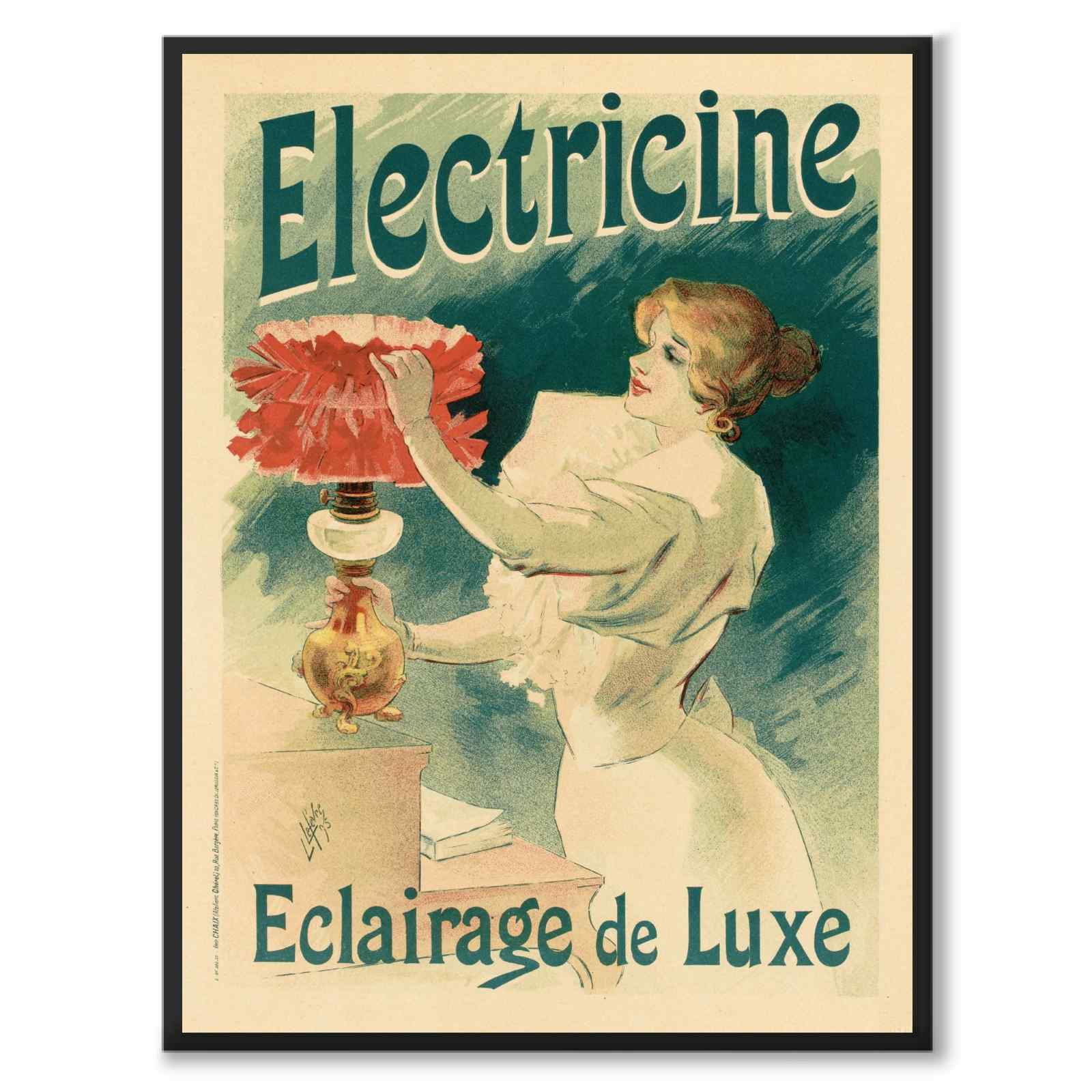 Affischen Electricine var en del av den ökande fascinationen för elektricitet och den nya teknologin som revolutionerade världen under slutet av 1800-talet. Bilden visar en kvinna i en vit klänning som står och undersöker en elektrisk lampa med röd skärm.