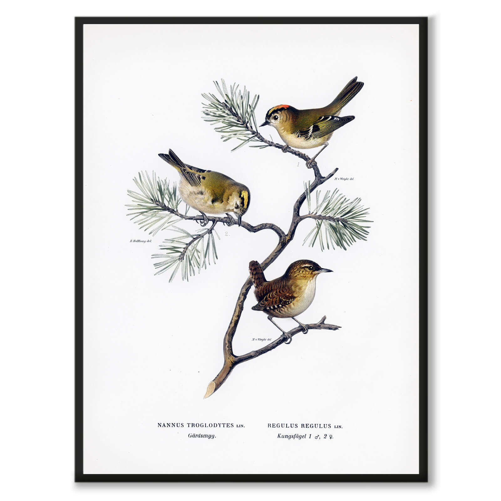 Poster med en gammal affisch av en Gärdsmyg och två Kungsfåglar. Illustrationen ritades av the von Wright brothers och publicerades i början av 1900-talet i boken Svenska Fåglar Efter Naturen Och På Sten Ritad. På bilden ser vi bland annat texten Nannus troglodytes och Regulus regulus - fågelarternas latinska namn.