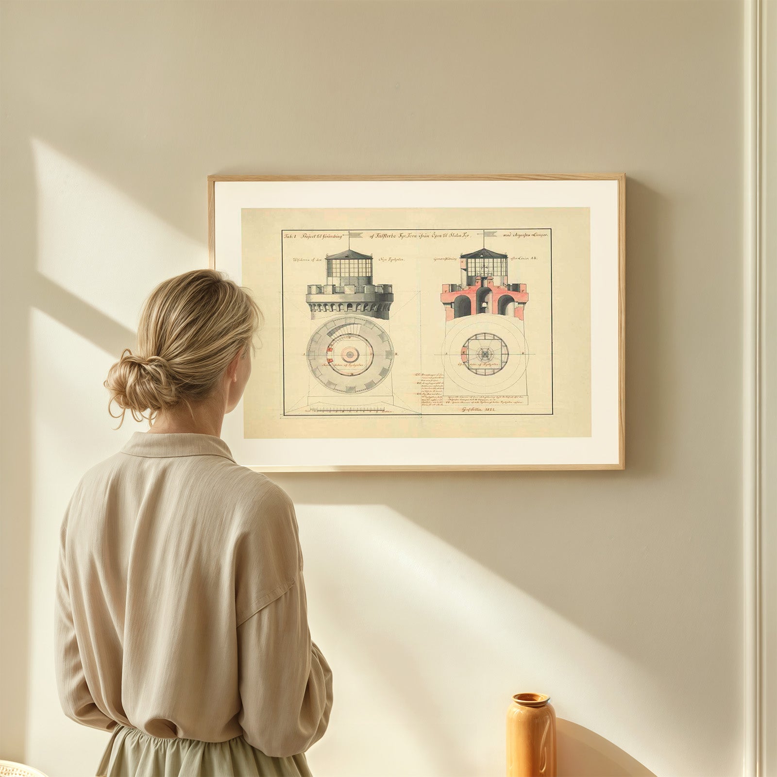 Poster med en gammal konstruktionsritning för ett fyrtorn vid Falsterbo, beläget på sydvästra kusten av Sverige.