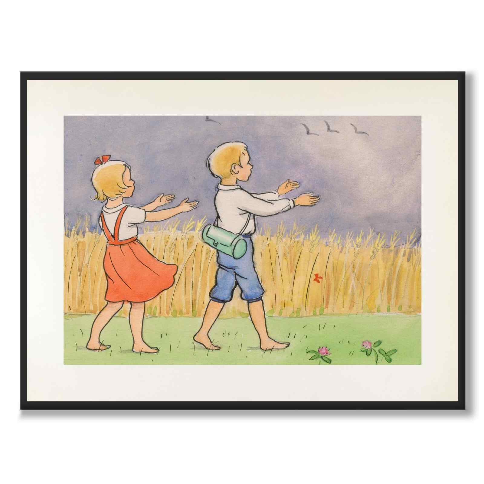 Bilden visar två barn går barfota över en gräsyta längs ett sädesfält och sträcker armarna framåt, som om de leker eller rör sig i takt. Pojken har en liten rulle eller väska hängande vid sidan och i bakgrunden syns fåglar på himlen och några blommor i förgrunden.