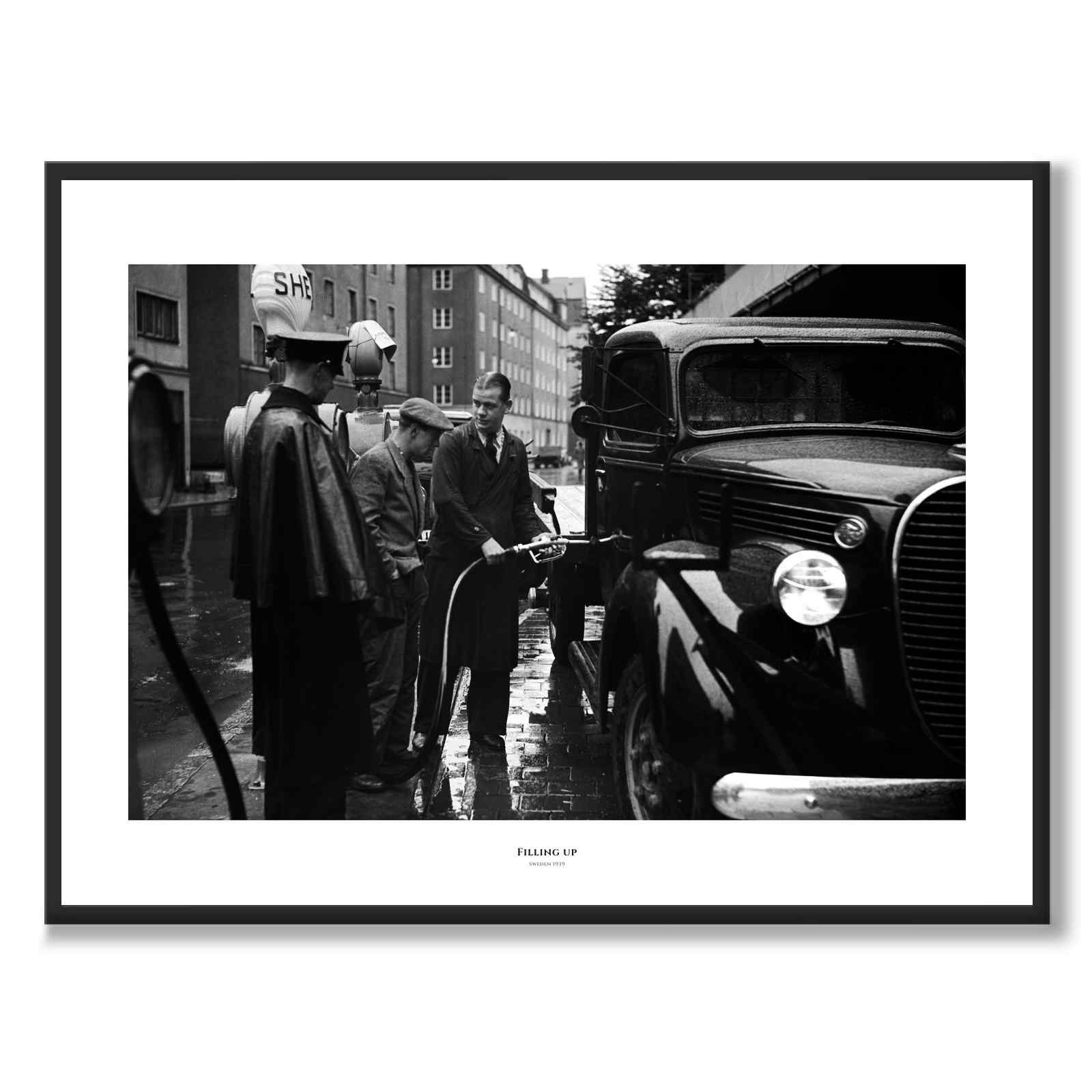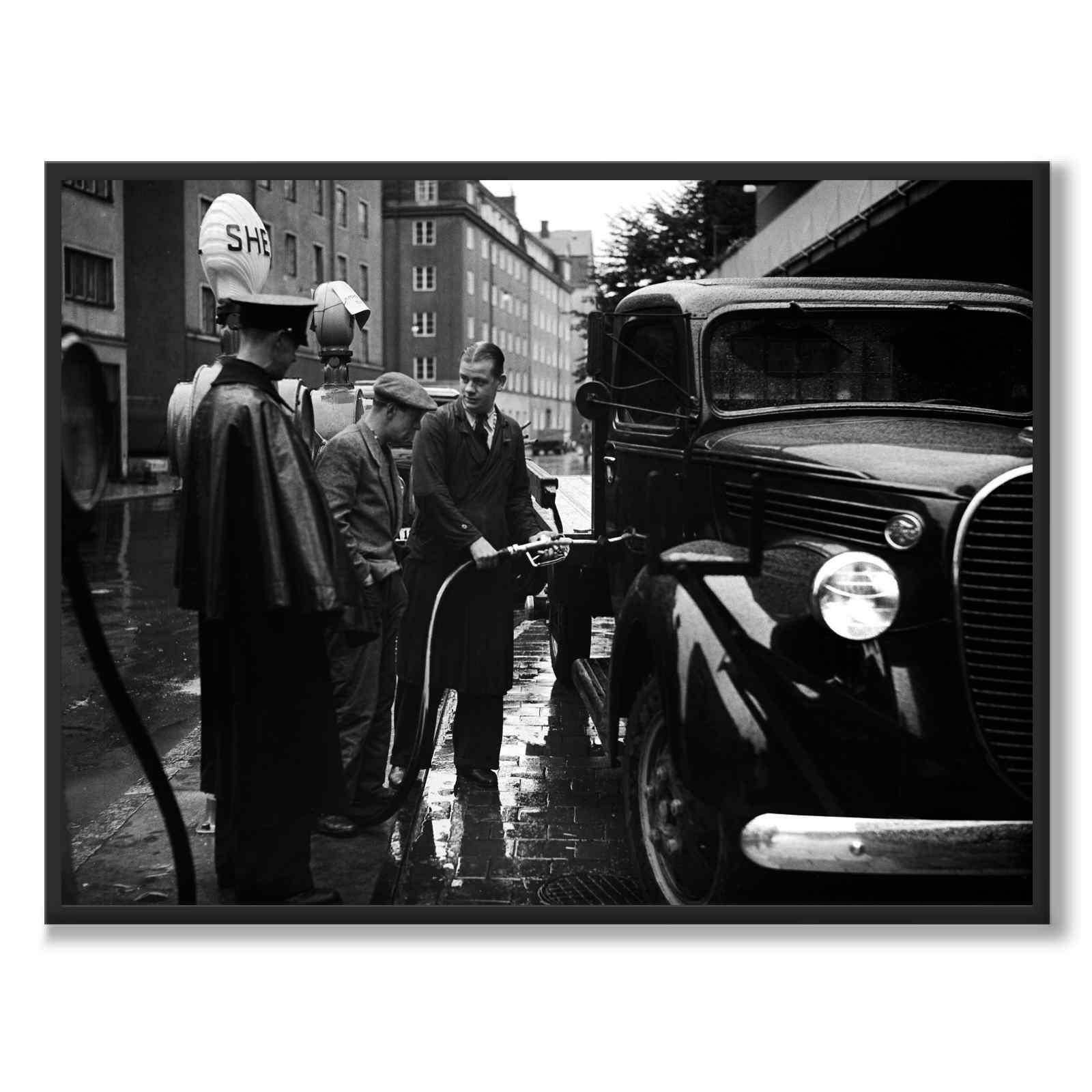 En man får hjälp att tanka sin bil vid Shellmacken på Pontonjärgatan på Kungsholmen. Andra världskriget har precis brutit ut och bensinköerna är långa.