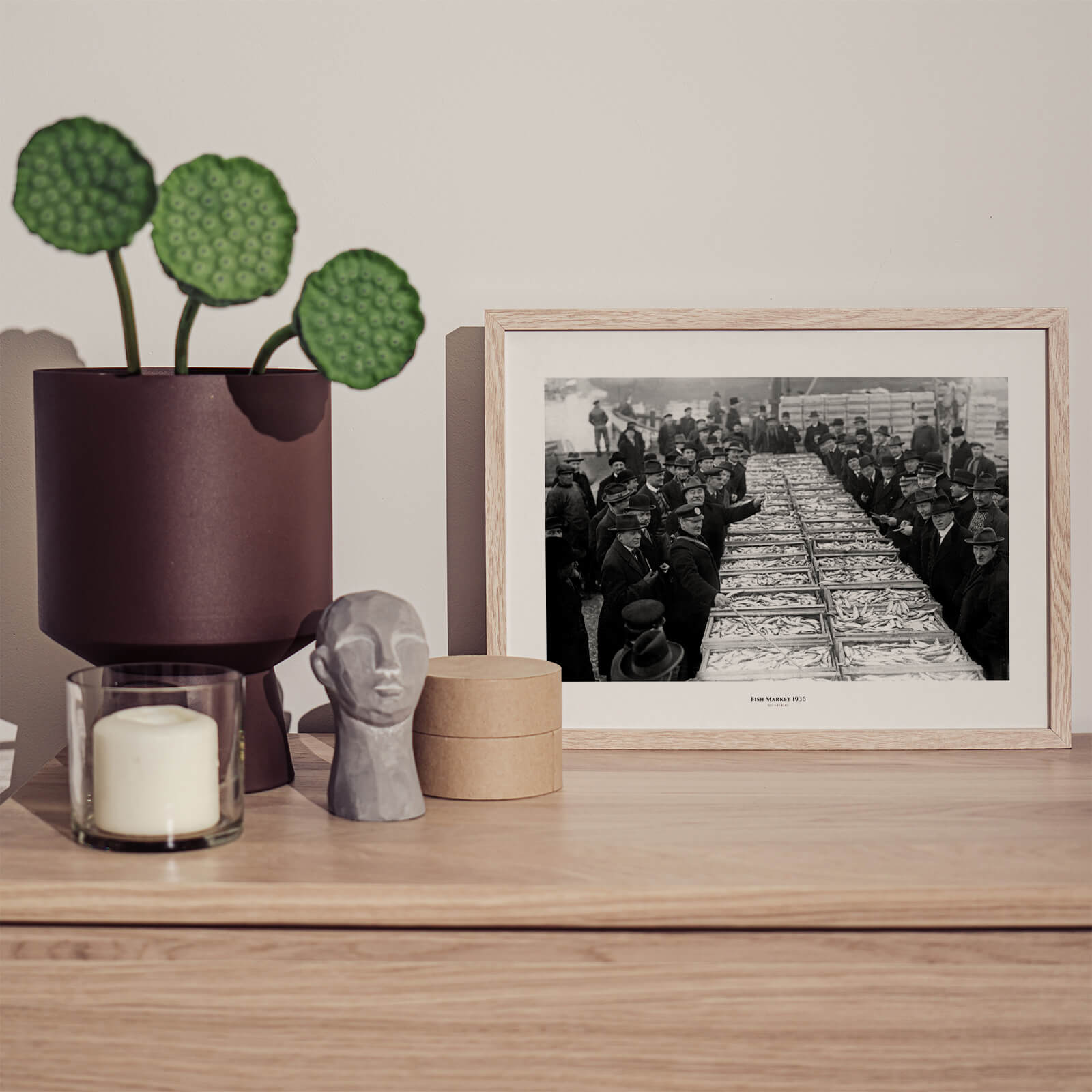 Poster med ett unikt fotografi från Göteborg år 1936. När fångsten av sill var så här stor som på bilden fick inte all fisk plats i fiskhallarna i Göteborgs fiskhamn. Affärer och fiskauktioner fick hållas utomhus. På bilden ser vi lådor fyllda med sill och män i rock och hatt som medverkar i auktionerna. Sillfisket har sedan länge haft stor betydelse för ekonomin i många länder, inte minst Sverige.